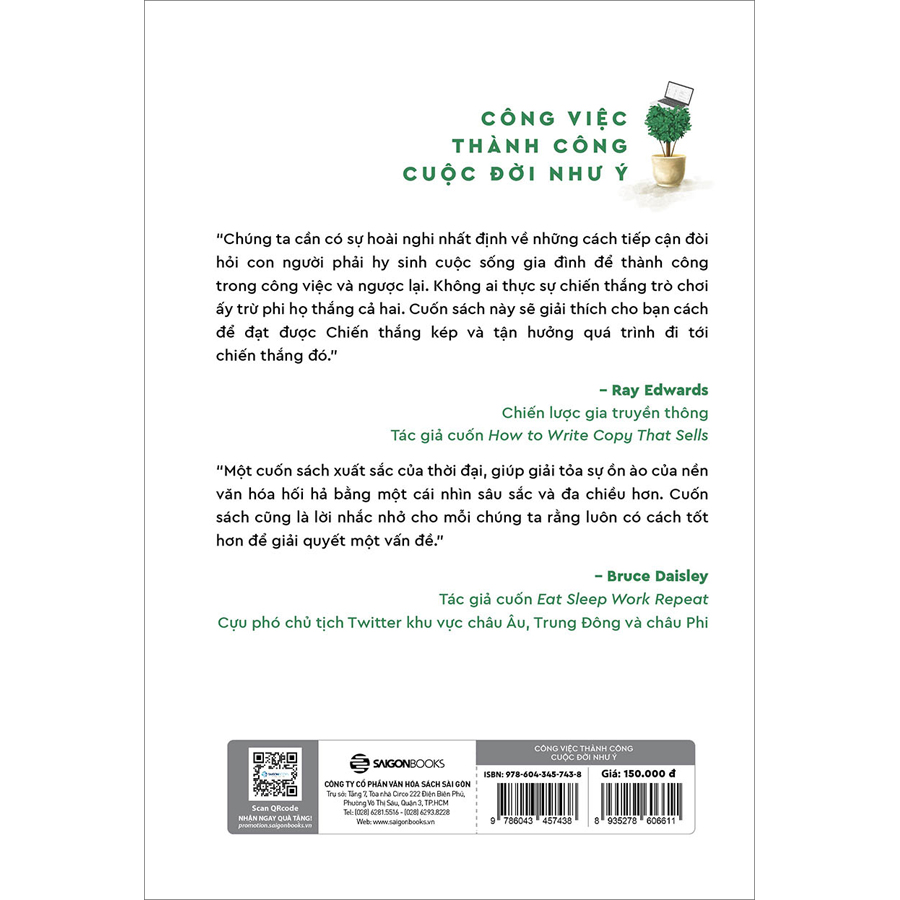 Ngoài ra, cuốn sách này cũng được hỗ trợ bởi nghiên cứu học thuật từ khoa học tổ chức và tâm lý học, đồng thời được minh họa bằng các nghiên cứu điển hình mở rộng từ các lĩnh vực kinh doanh khác nhau. “Công việc thành công - Cuộc đời như ý” là tuyên ngôn về cách bạn có thể đạt được cân bằng giữa công việc và cuộc sống và khôi phục sự tỉnh táo của bạn.