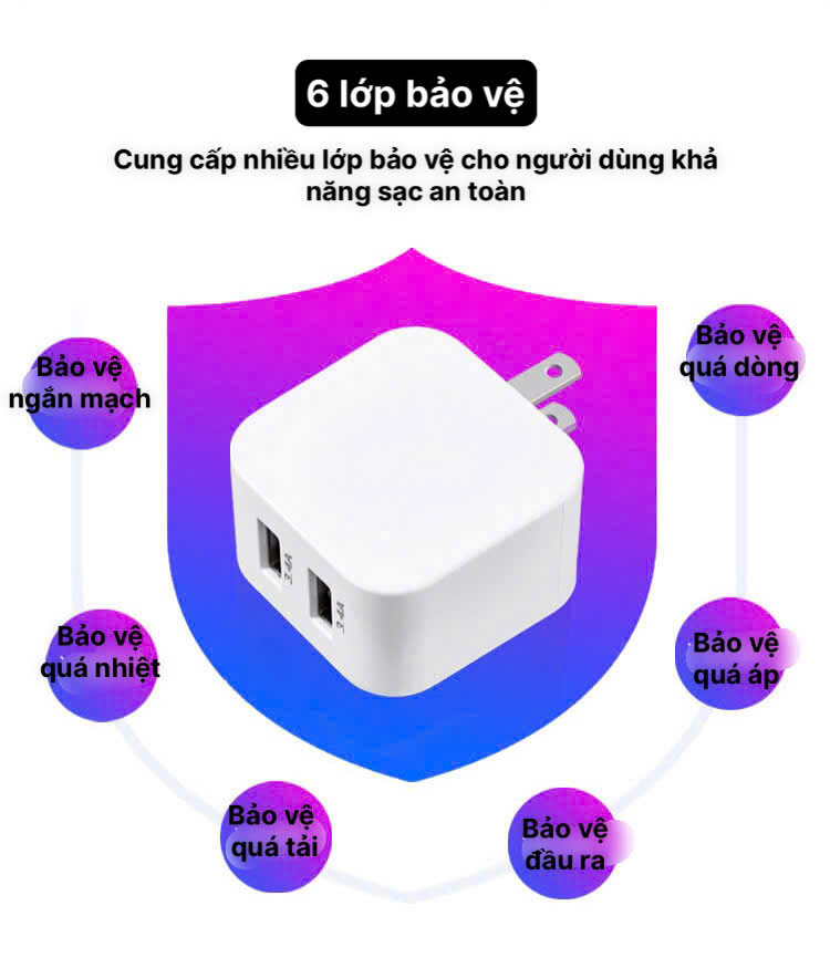 Củ sạc có chức năng tự phân bố dòng điện sạc an toàn khi mất điện mà có lại đột ngột, có chức năng bảo vệ khi quá áp, quá dòng, bảo vệ tĩnh điện, bảo vệ ngắn mạch, bảo vệ nhiệt độ không nóng khi dùng