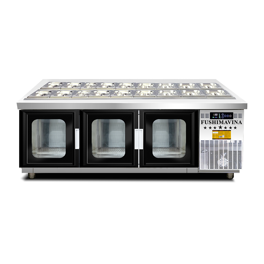 CHÀO MỪNG QUÝ KHÁCH ĐẾN FUSHIMA CHÍNH HÃNG! Fushimavina chuyên cung cấp các thiết bị lạnh công nghiệp cho các mô hình kinh doanh nhà hàng, khách sạn, quán cafe, tiệm trà sữa, quầy bar, căng tin, trường học, bệnh việ CAM KẾT VỚI KHÁCH HÀNG: 100% sản phẩm đúng với hình ảnh và mô tả - Đóng gói sản phẩm chắc chắn - Nhân viên tư vấn miễn phí và nhiệt tình - Hỗ trợ giao hàng nhanh chóng trên cả nước! MÔ TẢ SẢN PHẨM: Model: FSM-BSLCK1.8 Kích thước: 1800 x 750 x 850(mm) hoặc 1800 x 600 x 850mm Cánh tủ bằng kính Dung tích: 400 lít Nhiệt độ: 0ºC ~ 8ºC Điện áp: 220V Công suất: 500W Trọng lượng: 120kg Cơ chế làm lạnh gián tiếp bằng quạt gió SHOP TIPS: