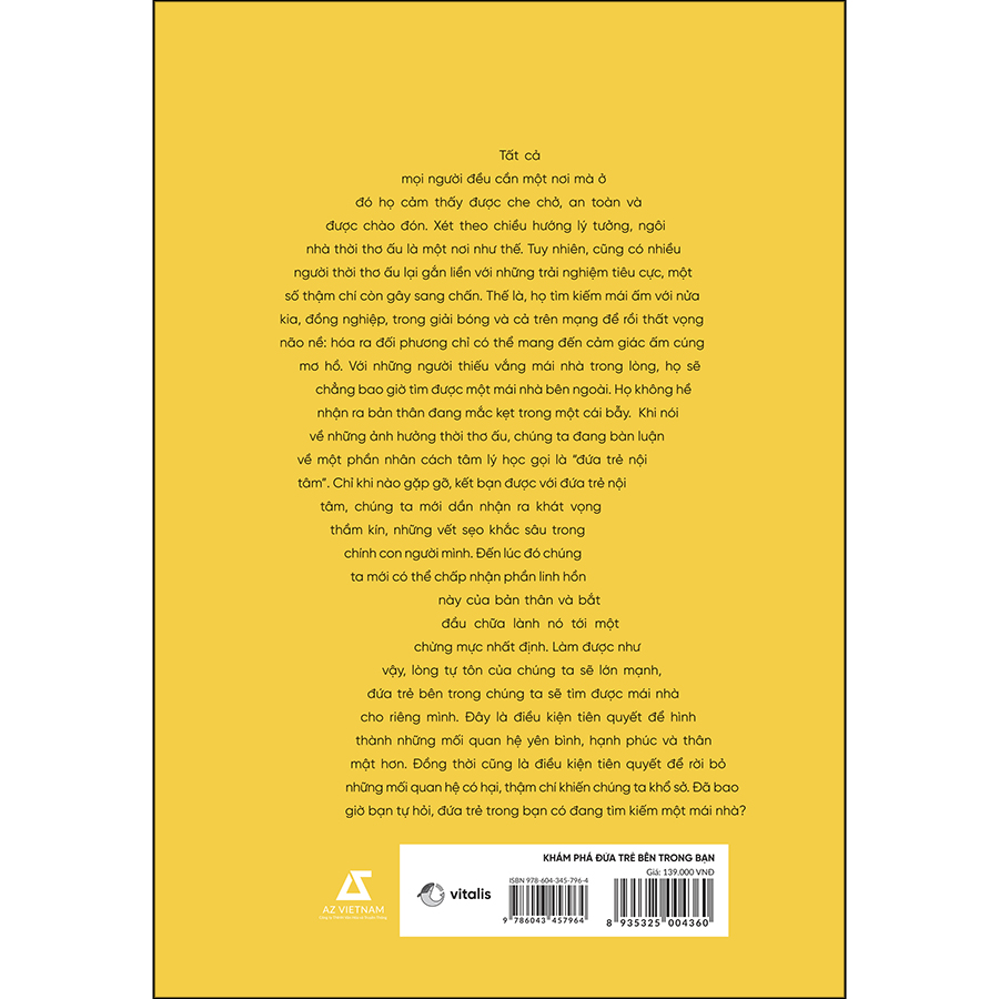 Trong cuốn sách “Khám phá đứa trẻ bên trong bạn”, tác giả Stefanie Stahl sẽ giúp bạn kết nối với đứa trẻ bên trong để tìm được mái ấm cho riêng mình, cách đạt được hạnh phúc, điều tiết cảm xúc và tin tưởng bản thân, xây dựng các mối quan hệ lành mạnh hơn. Và hãy nhớ rằng, chỉ khi nào gặp gỡ, kết bạn được với đứa trẻ nội tâm, bạn mới dần tìm ra được khát vọng thầm kín, những vết sẹo khắc sâu trong chính con người mình. Đồng thời đó cũng là chiếc khiên bảo vệ bạn khỏi những mối quan hệ độc hại không mong muốn.