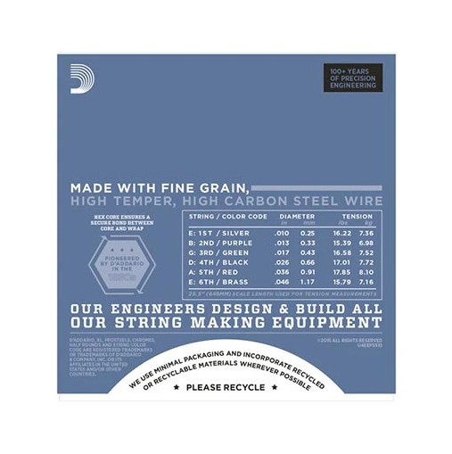 Mua tại TiktokD'Addario EPS510 ProSteels Electric Guitar Strings, Regular Light, 10-46 D'Addario XL ProSteels sử dụng hợp kim thép không gỉ độc quyền cho âm sắc siêu sáng mà không bị overtones chát tai. Tạo được âm cao sáng, âm trầm hài hoà, kết hợp với âm thấp rõ. ProSteels là sự lựa chọn lý tưởng cho người chơi đang cần thêm âm ngân. Sáng, to và mạnh, dây đàn mang đến sự thay thế tuyệt vời cho nickel để có âm thanh sắc nét hơn. EPS510 regular light gauge set như mọi dây guitar D'Addario, đi kèm bao bì chống ăn mòn thân thiện với môi trường tạo nên sự tươi mới. Đặc tính của D'Addario EPS510