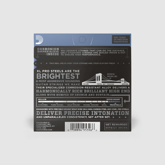 D'Addario EPS510 ProSteels Electric Guitar Strings, Regular Light, 10-46 D'Addario XL ProSteels sử dụng hợp kim thép không gỉ độc quyền cho âm sắc siêu sáng mà không bị overtones chát tai. Tạo được âm
