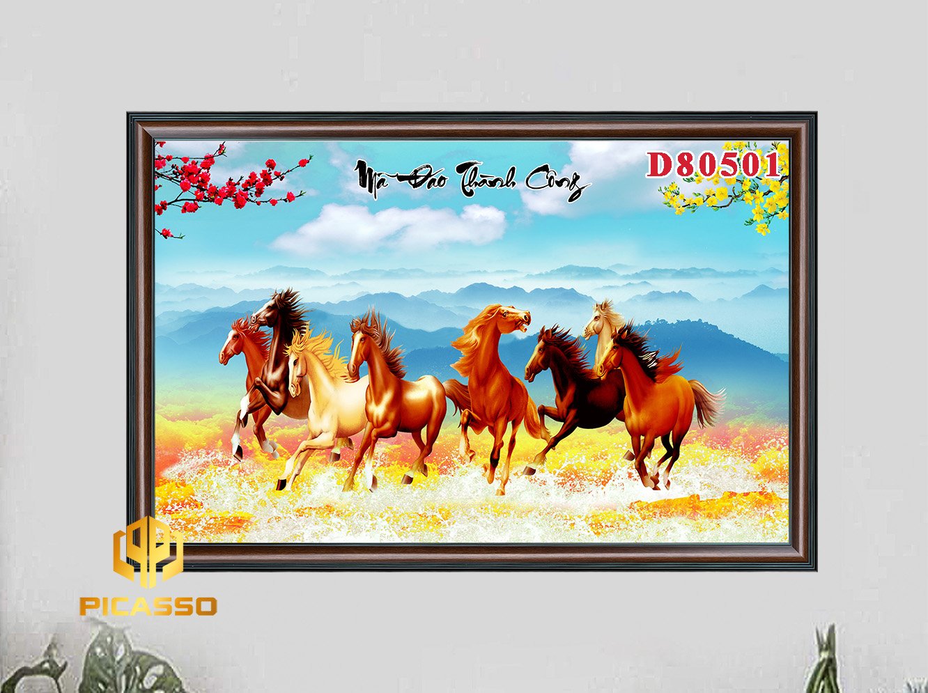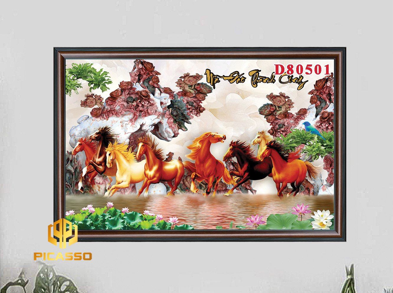 Tranh Bát Mã truy phong mạ vàng (Tranh Mã Đáo Thành Công) mang nhiều ý nghĩa phong thủy tốt lành. Là biểu tượng của Đoàn Kết - Thịnh Vượng - Thành Công. Đây được xem là