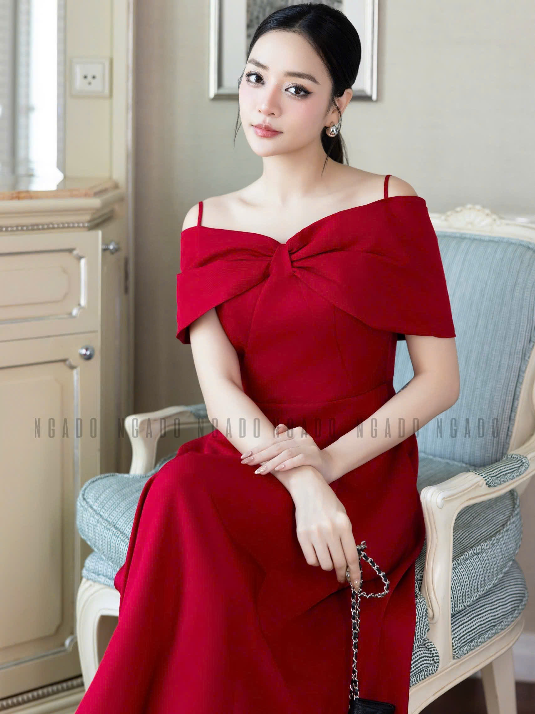 ✨Đầm đỏ bẹt vai NGADO , đầm xòe dáng dài , đầm dự tiệc