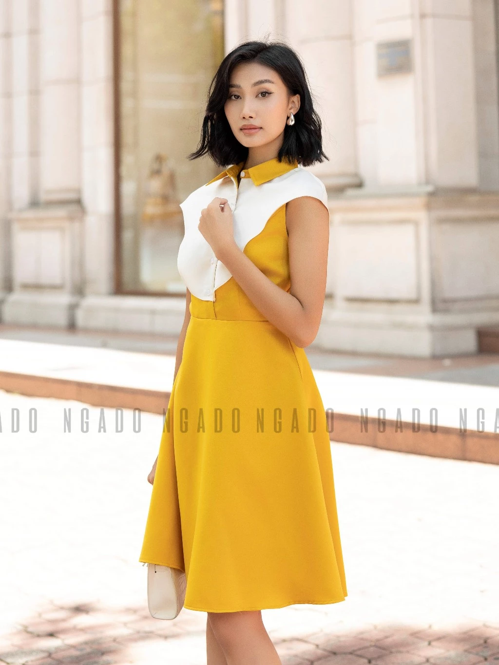✨Đầm vàng tay con NGADO , đầm ngắn dự tiệc , đầm dạo phố