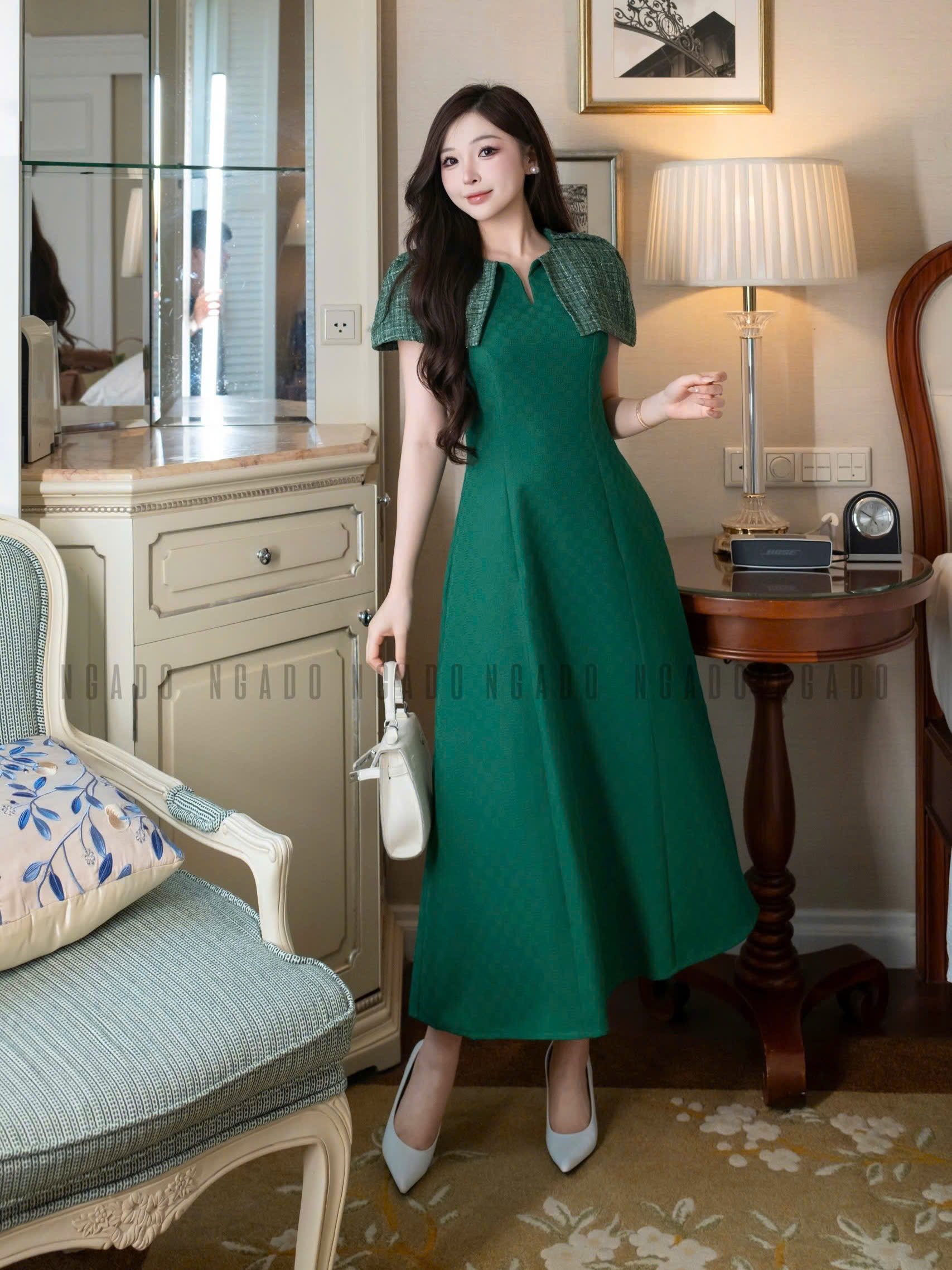 ✨Đầm xanh lá phối tweed NGADO , đầm dự tiệc dáng dài , đầm thiết kế