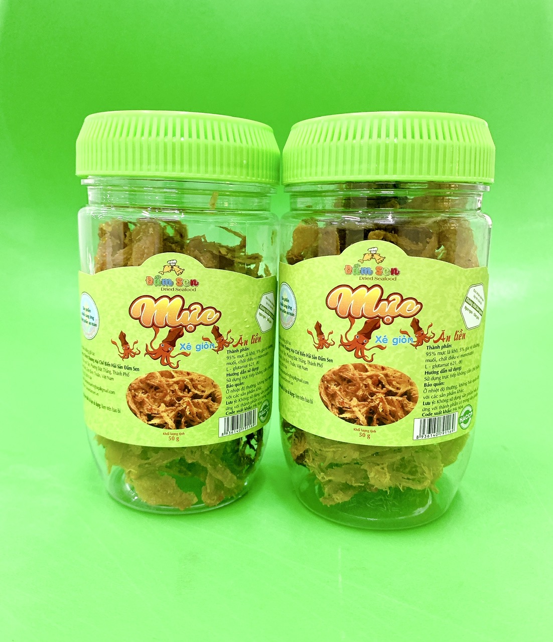 Thành phần: 85% Mực khô xé sợi, 3% lá chanh, 12% gia vị (đường, muối, ớt, bột ngọt, hành phi, tỏi, lá dứa, nước cốt dừa) Hạn sử dụng: 12 tháng kể từ ngày sản