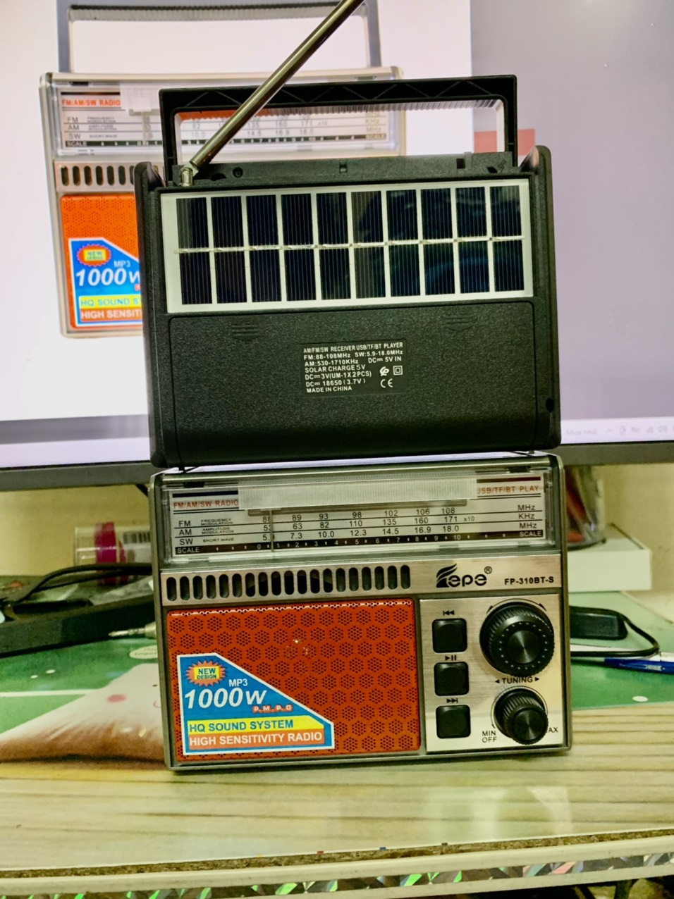 - Hãng : Fepe - Model: Fp-310BT - Radio 3 Bands AM / FM / SW - Tích hợp khe cắm Thẻ nhớ / USB định dạng MP3 - Hỗ trợ Bluetooth - Có Tấm thu năng lượng mặt trời Solar panel - Jack đầu vào AUX - ANTEN độ nhạy cao - Điện đầu vào AC 220V-240V / 50Hz / 60Hz - Khe lắp 2 pin đại ( không gồm pin ) - Tích hợp khe cắm pin sạc: H2pro tặng kèm 1 pin sạc 18650 - Máy thu tần số FM 88-108MHz / AM 530-1600 KHz / SW8.0-16MHz - Công suất 10W - Kích thước sản phẩm ( D x R x C ) : 18 x 10 x 12 (cm) - Cân nặng đóng hộp: 600g - Bộ sản phẩm gồm: 1 x Đài radio bluetooth Fepe Fp-310BT, 1Pin sạc . Dây sạc