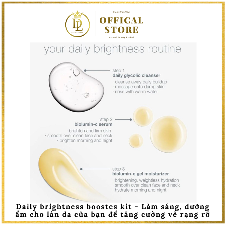 Mua tại TiktokBộ công cụ này giúp: -Làm sạch và loại bỏ sự tích tụ -Làm sáng và giảm sắc tố không cân bằng -Cung cấp hydrat hóa không trọng lượng Bộ Kít gồm: 1 Daily Glycolic Cleanser - sữa rửa mặt làm sáng, dưỡng 1 BioLumin-C Serum - huyết thanh vitamin c làm sáng 1 BioLumin-C Gel Moisturizer - dưỡng ẩm vitamin c dưỡng ẩm Mối quan tâm về da: