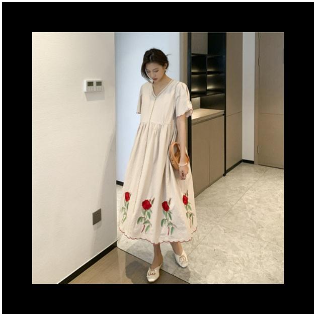 ĐẦM BẦU THỜI TRANG PHỐI BÈO LAI Chất liệu: cotton lạnh Kiểu dáng: đầm suông rộng, cổ tròn, tay ngắn bẻ lai, cài nút, lai đầm phối bèo, dây cột eo Size: free (44~64kg, vai