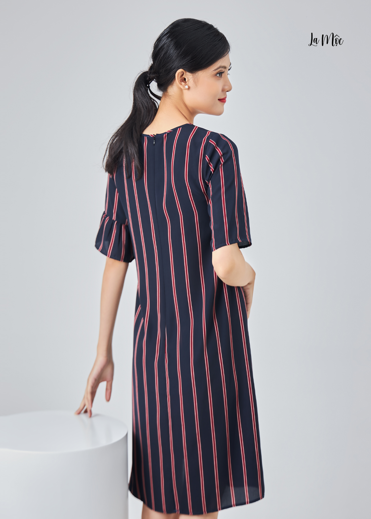 Đầm lụa La Mộc cổ tròn, chất liệu lụa Korea, hoạ tiết sọc dọc tím trắng đỏ, cúp cách điệu nhún nhẹ phần chân váy và phần hông.