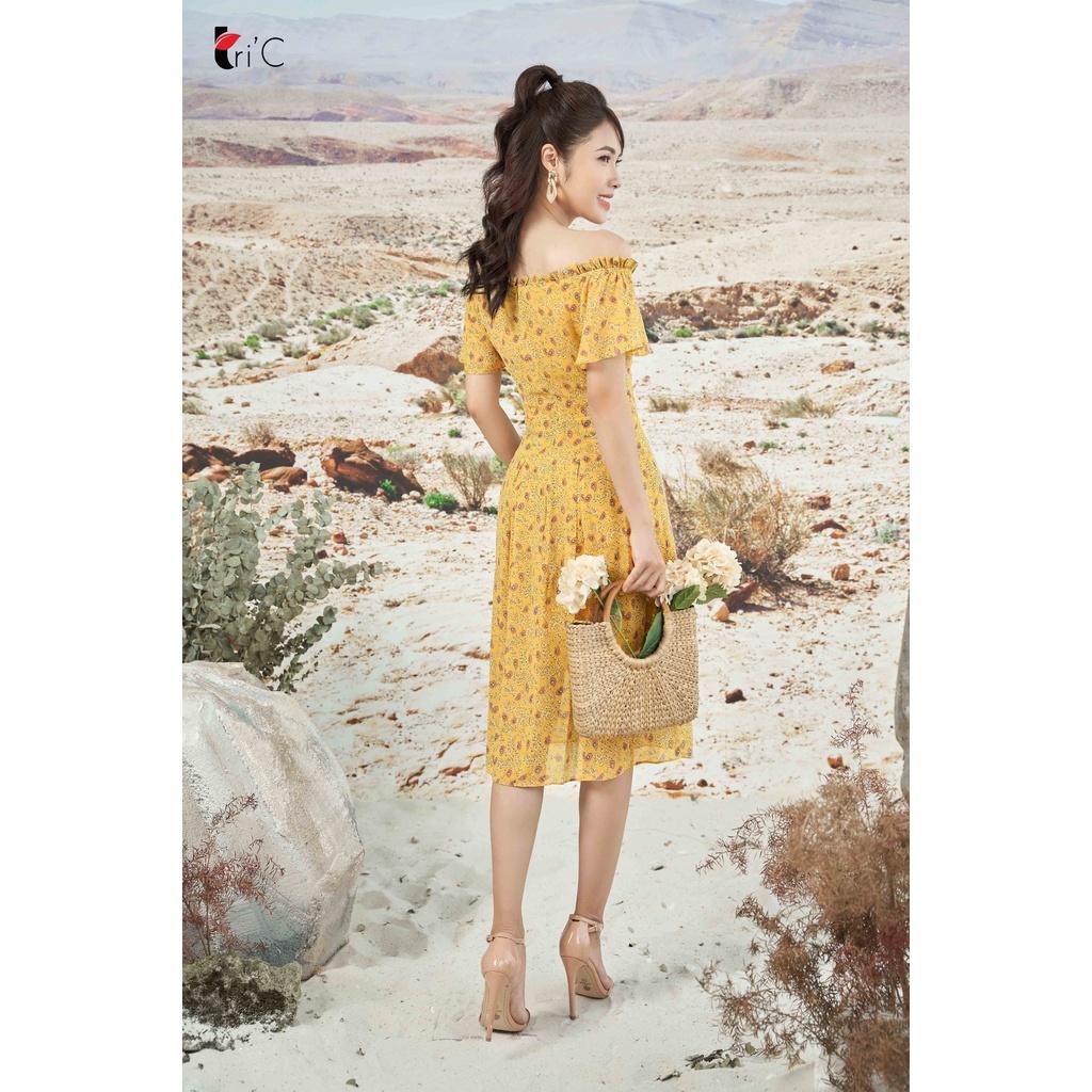 ✨Đầm maxi hoa nhí hở vai, chân xếp ly Tri'C Luxury A24221 Vàng