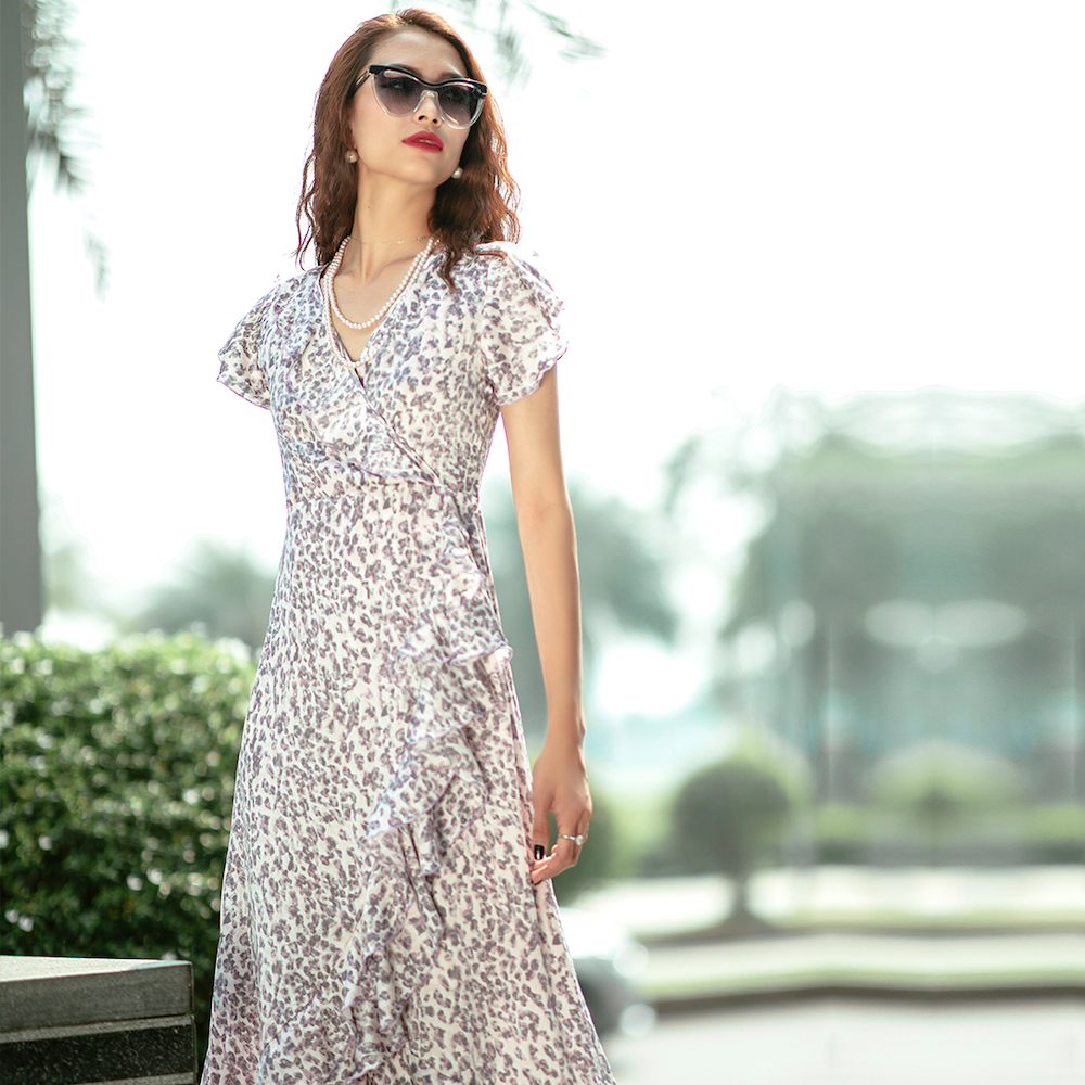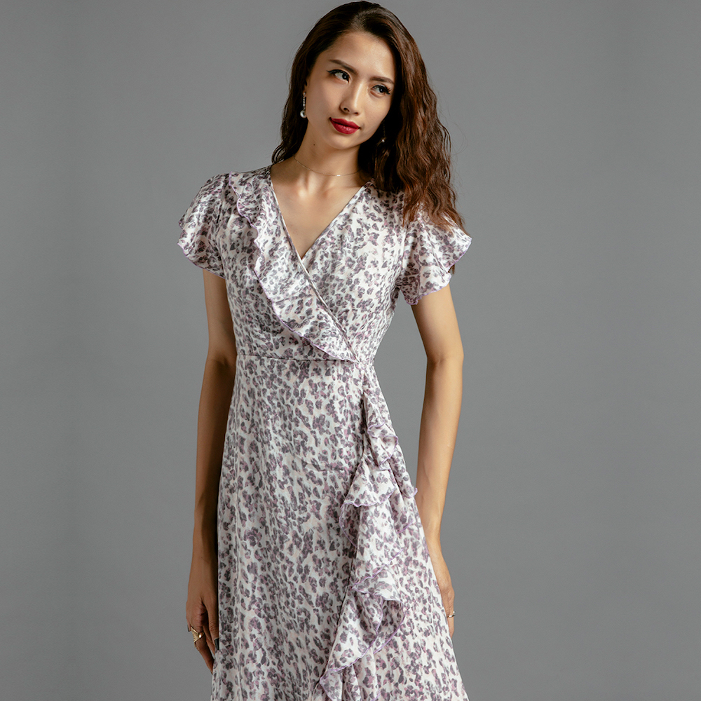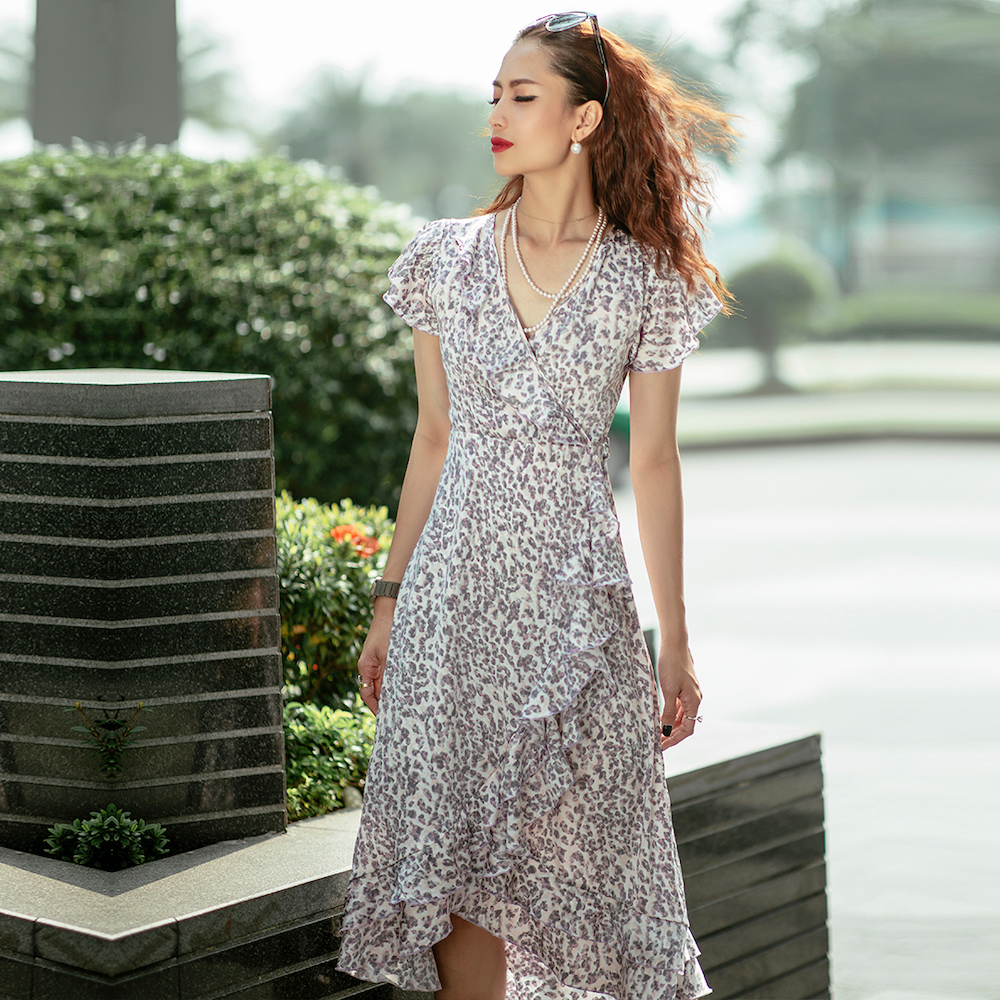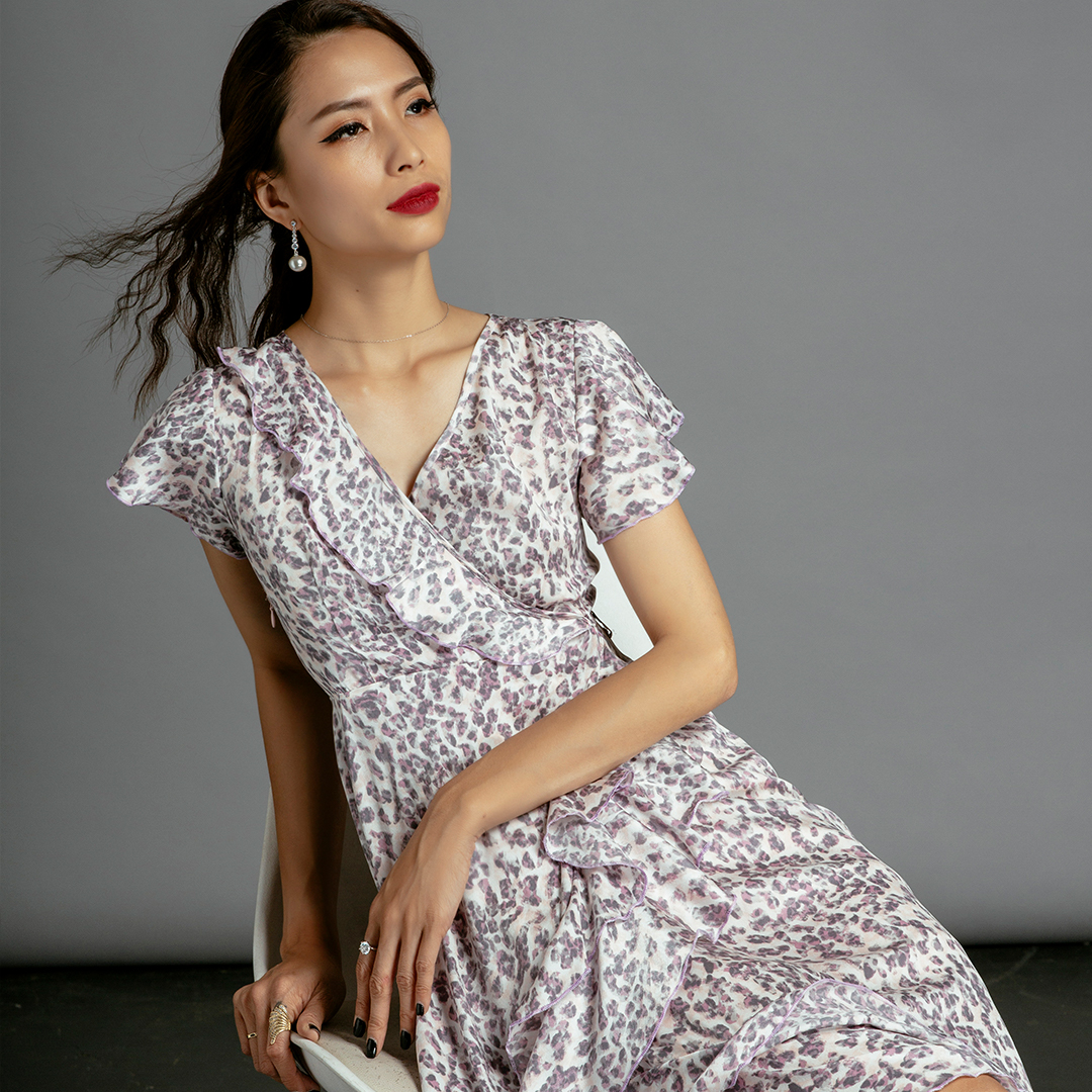 Đầm Midi Đắp Vạt mang một chút hơi thở cổ điển vintage trong thiết kế với những điểm xuyến bèo nhún thướt tha. Trên nền satin in hoạ tiết da beo nhí, chiếc Đầm Midi Đắp Vạt lại thổi hồn tự do hoang dã.