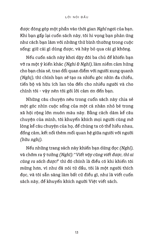 … Các mẩu chuyện nhỏ trong cuốn sách này có màu sắc chung là câu chuyện về những lựa chọn. Truyền thống hay phi truyền thống, mới hay cũ, tốt hay xấu, đúng hay sai là những đánh giá không có tính tuyệt đối. Chúng tùy thuộc vào hệ quy chiếu lăng kính, đối tượng, thời gian mà bạn chọn. Dám Nghi – Dám Nghĩ – Dám Nghỉ khuyến khích bạn gieo một sự hoài nghi vừa vặn để thôi thúc bạn đi tìm câu trả lời với một cái đầu mở, một trái tim nhạy cảm hồn nhiên để biết nghĩ cho bản thân cũng như cho người khác, và một sự dũng cảm để bỏ đi giá trị không còn đúng người đúng chỗ. Khi nói đến “Dám”, tôi cổ vũ sự thử nghiệm chừng mực và đề cao việc cân nhắc an toàn. Nói cách khác, tôi khuyến khích sự thử nghiệm liều lĩnh bứt phá theo tinh thần của các môn thể thao mạo hiểm: bạn nên trang bị thiết bị bảo hộ cần thiết, hỏi ý kiến chuyên gia và người có hiểu biết về pháp luật trước khi bắt đầu. Bạn cũng nên dự trù phương án xử lý sự cố. Dám nghi, dám nghĩ, dám nghỉ, hay dám hành động gì đi nữa chung quy cũng chỉ là để làm cho quỹ thời gian hữu hạn mỗi ngày trong cuộc đời này trở nên ý nghĩa nhất vì thời gian là nguồn tài nguyên quý giá nhất và không thể tái tạo lại của mỗi người. Tôi cảm ơn bạn vì đã dành thời gian cho quyển sách này.”