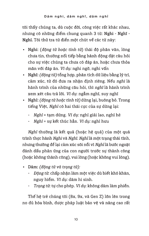 “Thế hệ trẻ chúng tôi (8x, 9x, và Gen Z) lớn lên trong no đủ hòa bình, được pháp luật bảo vệ và nâng cao rất nhiều quyền con người hơn các thế hệ trước. Ngộ nghĩnh là, điều làm thế hệ trẻ trăn trở nhiều nhất bây giờ lại là những cái Dám đã được luật pháp ủng hộ nhưng lại bị chi phối bởi người thân yêu hoặc người không thân quen, đó là: dám đặt câu hỏi (dám nghi), dám suy ngẫm (dám nghĩ), dám từ bỏ (dám nghỉ).