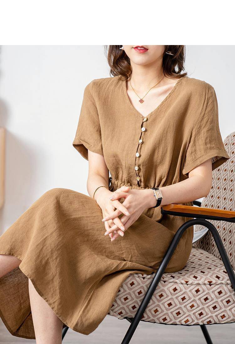 ✨Đầm nữ cổ V phong cách Hàn Quốc thanh lịch, chất linen mát, dầm có túi siêu xinh NH173 nâu