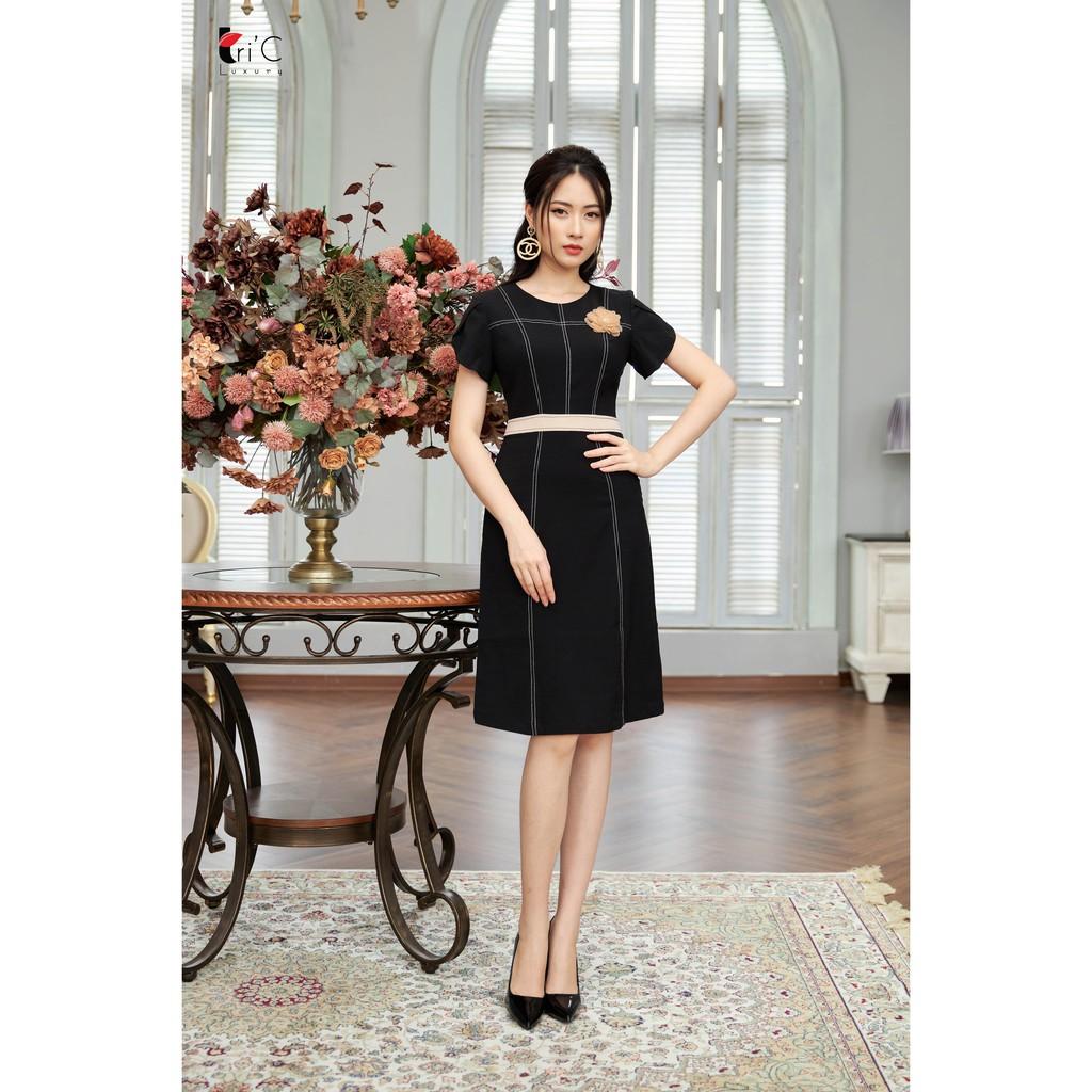 ✨Đầm ôm A Tri'C Luxury diễu chỉ nổi ngực cài hoa Đen A18120