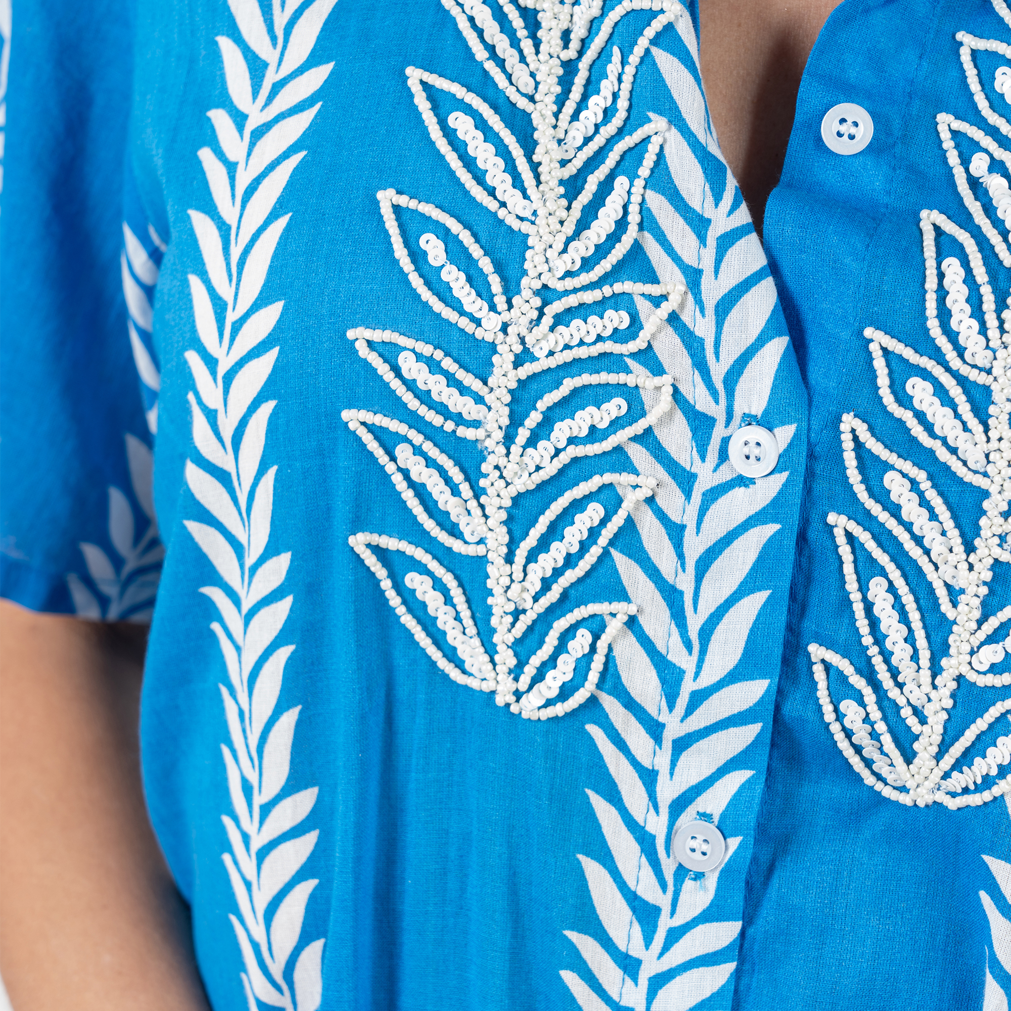 Đầm Sơ Mi Cotton, chất liệu cotton mềm mại, mỏng nhẹ. Phần trước ngực đính hạt tạo hình lá độc đáo. Mặc phối với quần short hoặc legging bên trong. Phom suông. Dài đầm 100cm
