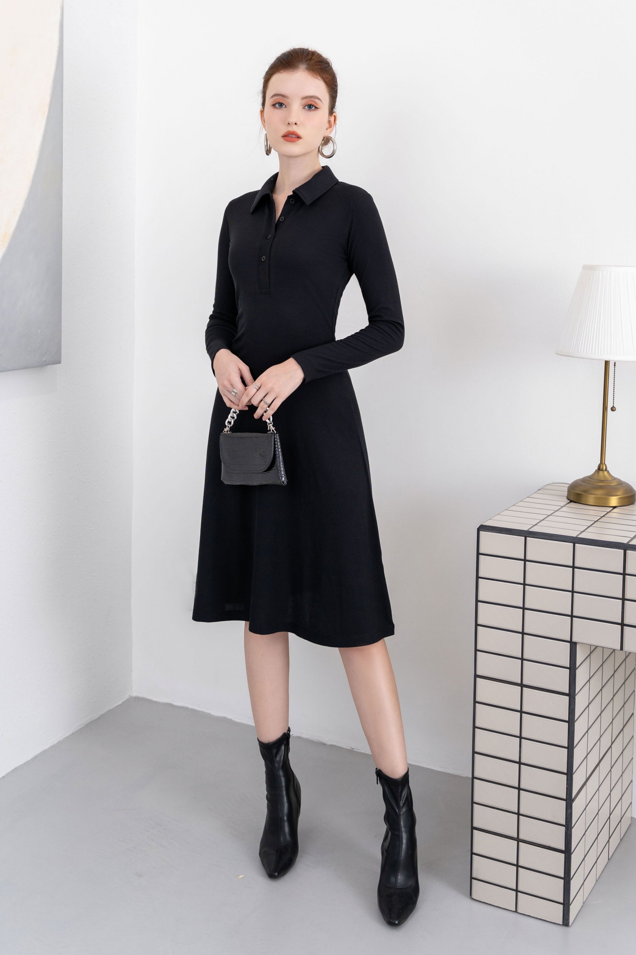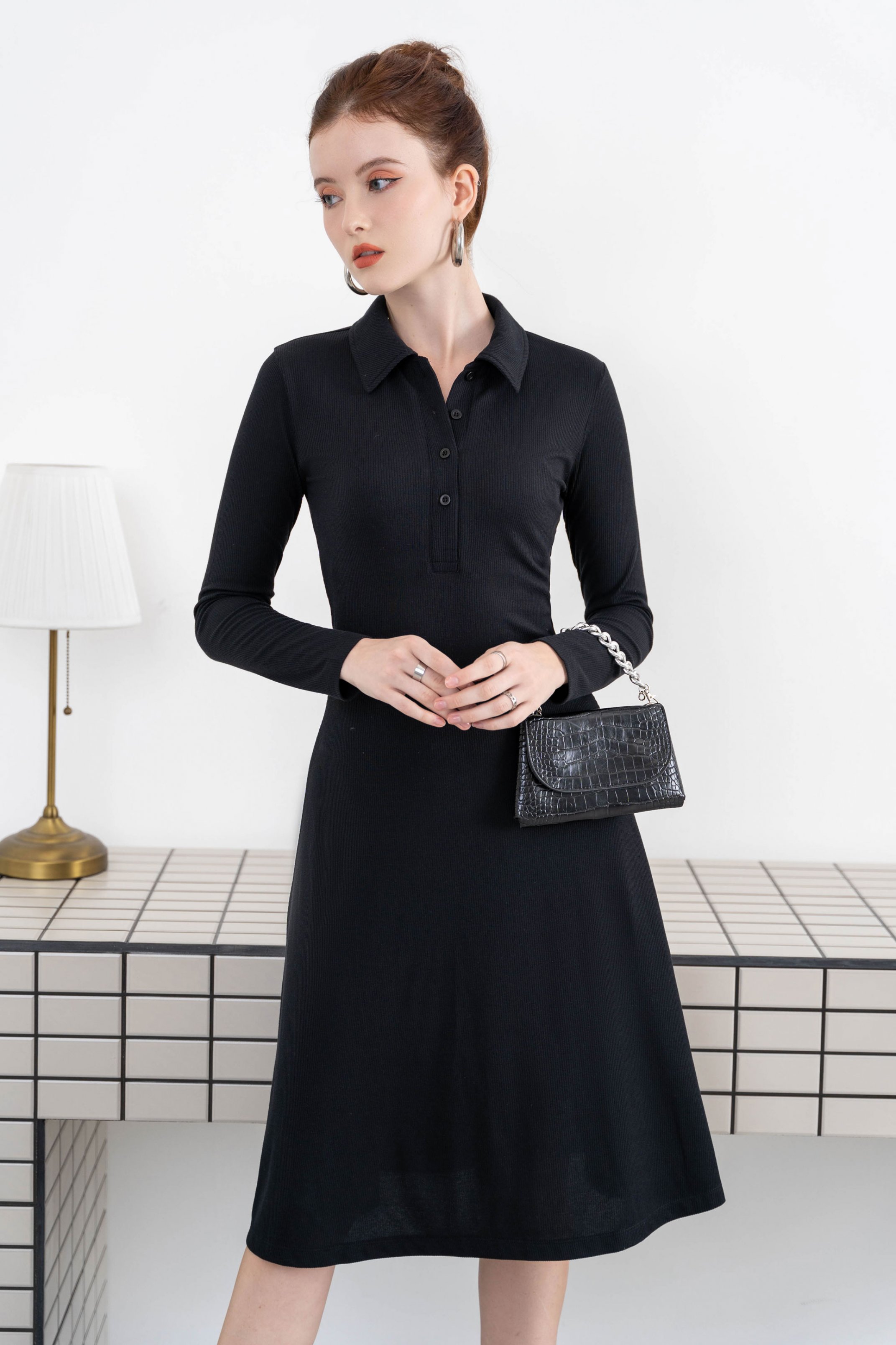 Mua tại TiktokCHẤT LIỆU BO GÂN SỚ NHỎ DÀY MỀM ĐẦM MÀU ĐEN, CỔ POLO NÚT GÀI FORM ÔM XÒE, TAY DÀI ĐẦM DÀI QUA GỐI ĐIỂM NHẤN LÀ CHIẾC NẸP ÁO DÀI VÀ TAG LOGO LAAS GẮN Ở LAI VÁY