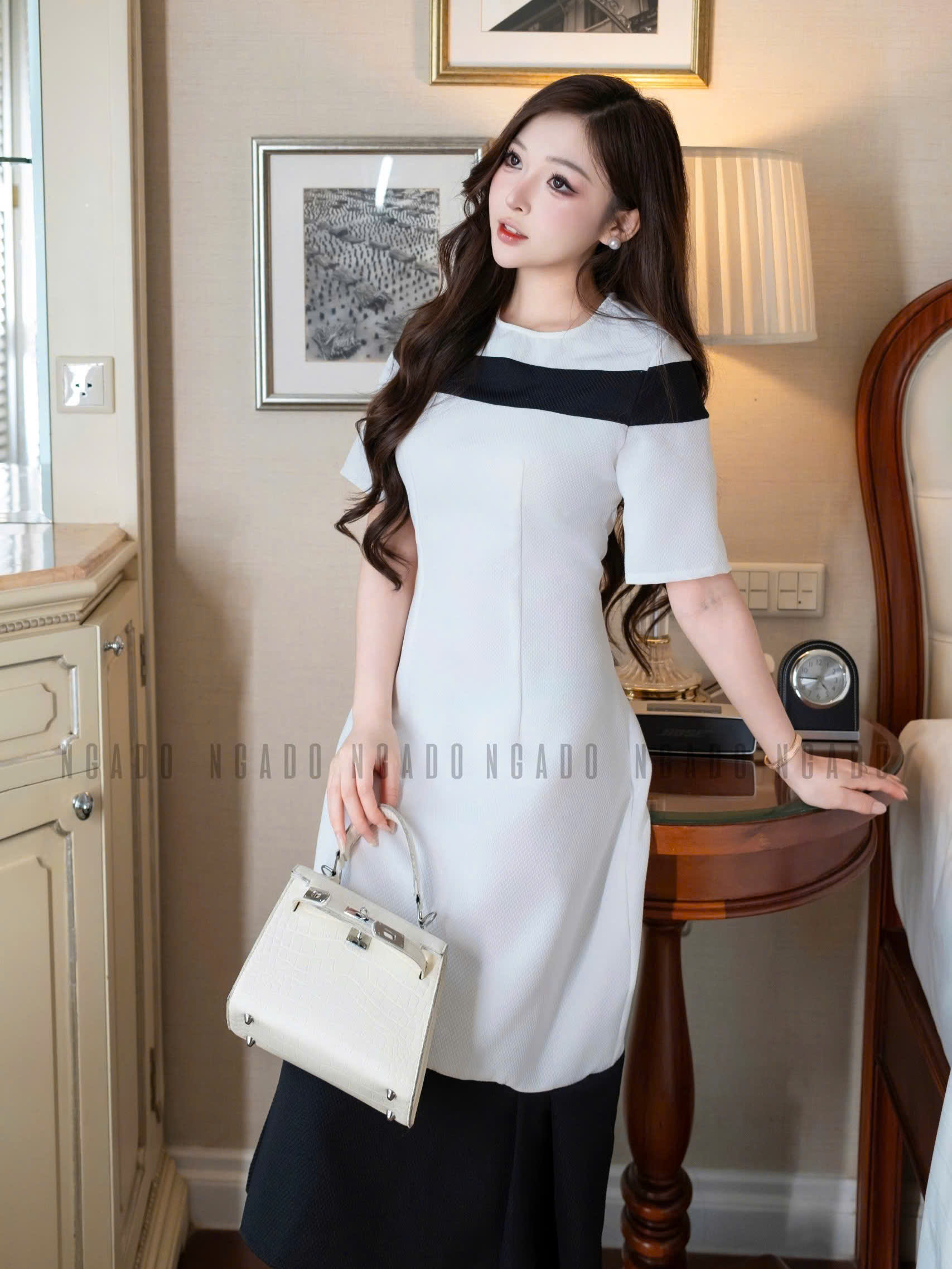 ✨Đầm trắng cổ tròn phối đen NGADO