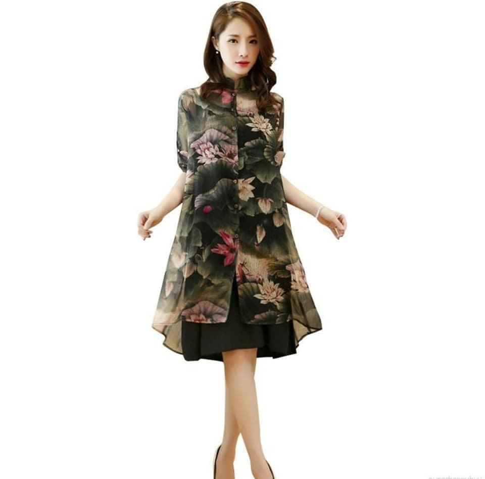 Đầm trung niên họa tiết Kích thước 43-59kg Chất liệu đầm đen thun + áo khoác ngoài voan chiffon họa tiết