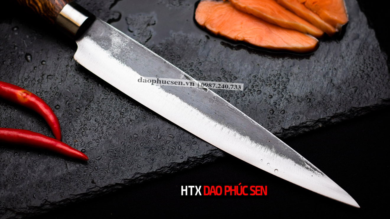 - Chức năng: chuyên lọc - thái cá thịt, rau củ. - Kích thước: Lưỡi: 21cm, cán: 12cm, rộng: 5cm, dầy: 2ly, trọng lượng: 200g - Cán : Gỗ mun , Khâu và chốt đồng