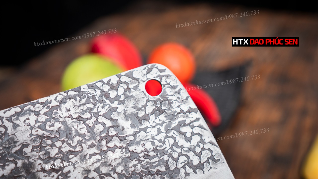 Dao chặt gà sắc bén - Thép nhíp ô tô - Cán mun khâu inox - N09TM Lựa chọn nguyên liệu 100% là nhíp ô tô ( Liên xô, Ifa ) được các thợ rèn giỏi gia công tỉ mỉ từ lưỡi dao cho đến cán dao đảm bảo việc băm chặt xương sắc - ngọt. Các sản phẩm của HTX Dao Phúc Sen thợ rèn đều sử dụng than củi khi nung thép cũng như tôi dao để đảm bảo lưỡi dao khi ra lò sắc bén và bền lâu. Nét đặc biệt của mẫu dao này là bề mặt lưỡi dao được thợ rèn giỏi của HTX Dao Phúc Sen đập rèn hoa văn tỉ mỉ đẹp mắt tạo nét khác biệt cho từng con dao và bề mặt hoa văn này còn có tác dụng chống dính bám thực phẩm khi chặt gà,vịt.