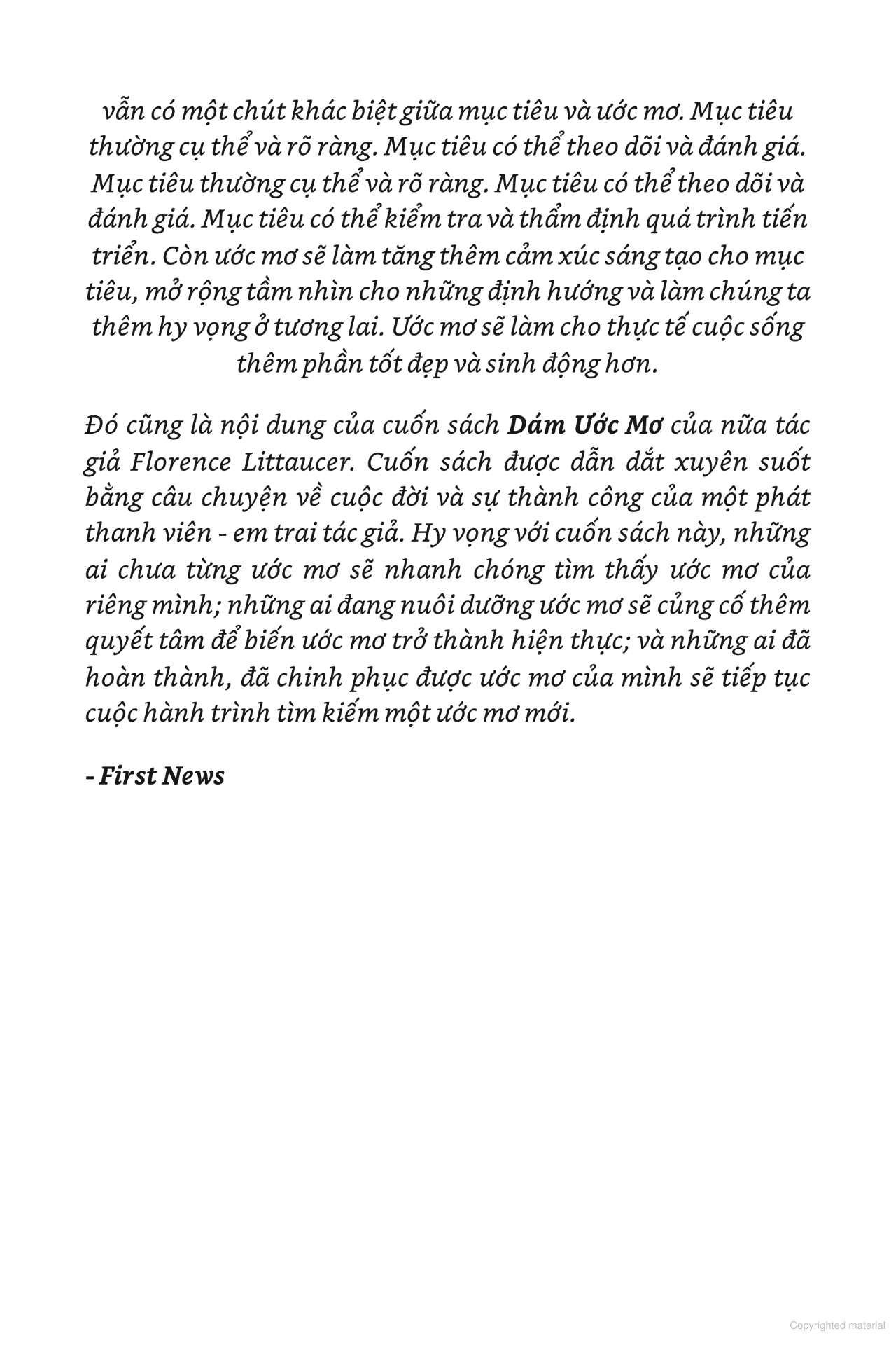Đó cũng là nội dung của cuốn sách Dám Ước Mơ của nữ tác giả Florence Littauer. Cuốn sách được dẫn dắt xuyên suốt bằng câu chuyện về cuộc đời và sự thành công của một phát thanh viên - em trai tác giả.