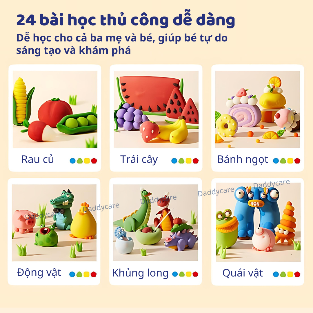 - 24 bài học thủ công dễ dàng: Dễ học ngay cả với ba mẹ và bé chưa có kinh nghiệm thủ công, giúp bé tự do sáng tạo và khám phá. Các chủ đề: Rau củ, Khủng long đầu bếp, Trái cây, Động vật nhỏ, Quái vật, Món tráng miệng.