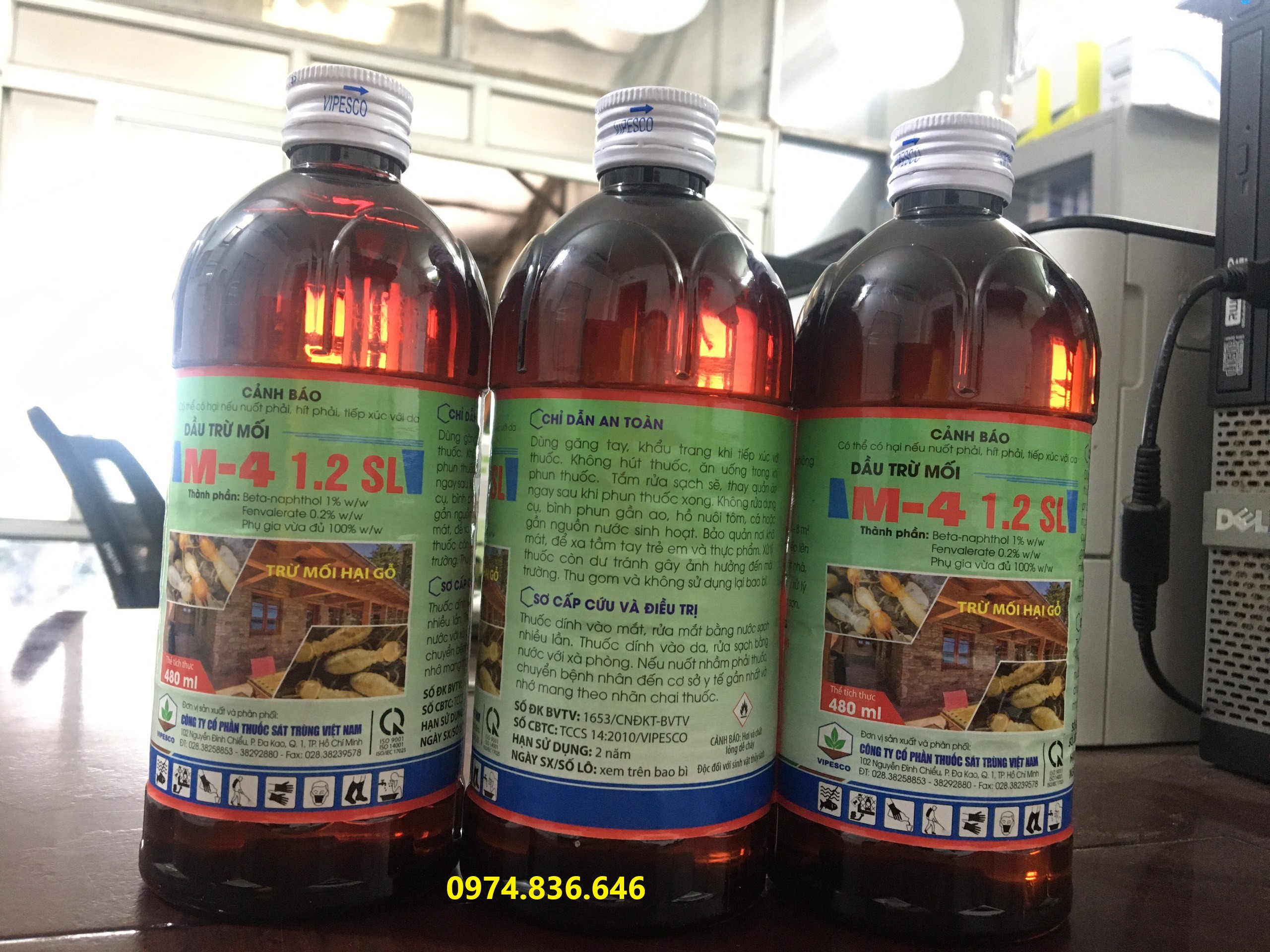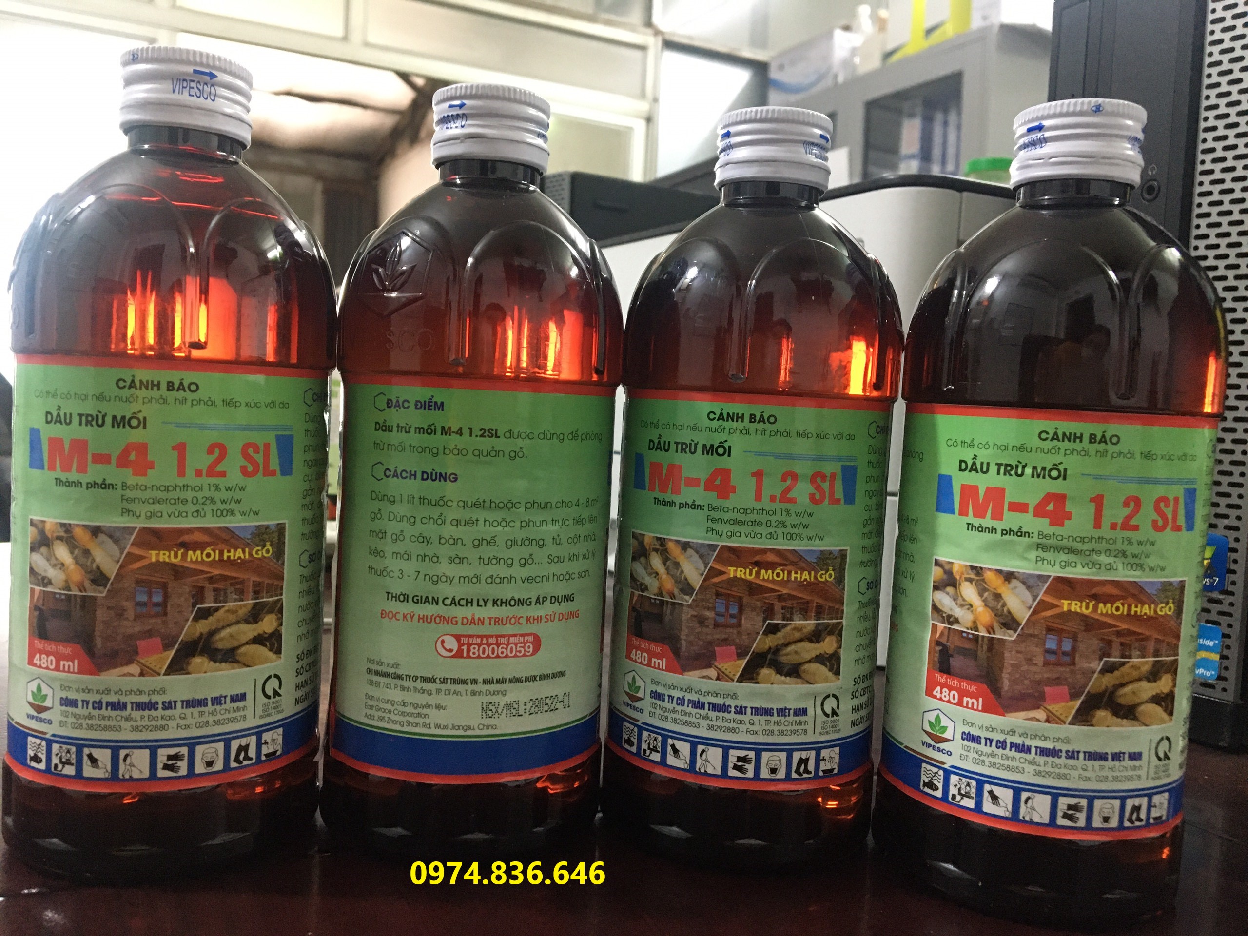 DẦU TRỪ MỐI M-4 1.2SL 480ml Vipesco THÀNH PHẦN: Beta- naphthol 1% w/w Fenvalerate 2.0% w/w Phụ gia vừa đủ 100% w/w Trừ mối hại gỗ Thể Tích Thực: 480ml Đặc Điểm: Dầu Trừ Mối