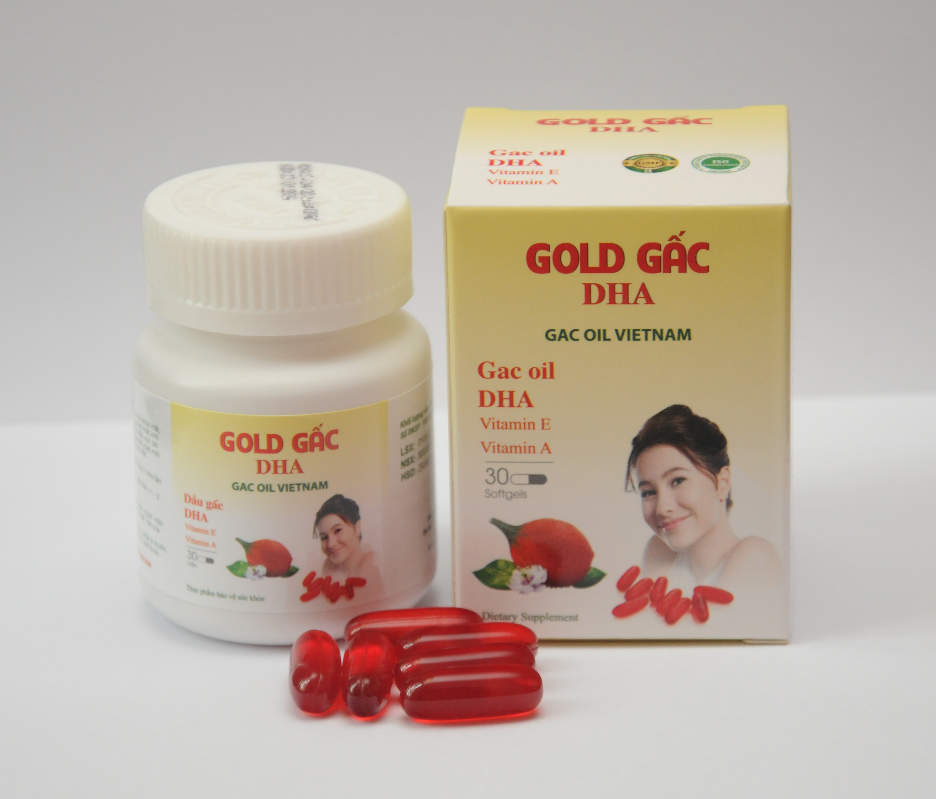 - Thành phần: Dầu gấc 400mg - DHA 10mg - Vitamin E 1mg - Vitamin A 1000IU. Phụ liệu: Gelatin, sáp ong trắng, dầu cọ, dầu đậu nành, lecithin, nipazil, nipazol, sorbitol, glycerin, ethylvanilin vừa đủ 1 viên. Chỉ tiêu chất lượng chủ yếu tạo nên công dụng của sản phẩm: STT Tên chỉ tiêu Đơn vị tính Mức công bố 1 DHA mg/viên 10 ± 29% 2 Beta-carotene mg/viên ≥ 0,2 3 Vitamin A IU/viên 1000 ± 29% 4 Vitamin E mg/viên 1 ± 29%.
