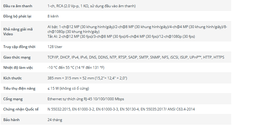 Thông số kỹ thuật đầu ghi hình IP 8 kênh AcuSense HIKVISION DS-7608NXI-K2 – Chuẩn nén H.265/H.265+/H.264/H.264+ – HDMI @1920 x 1080, VGA @1920 x 1080, 01 x RJ45 0/100/1000 Mbps, 02 x USB. –