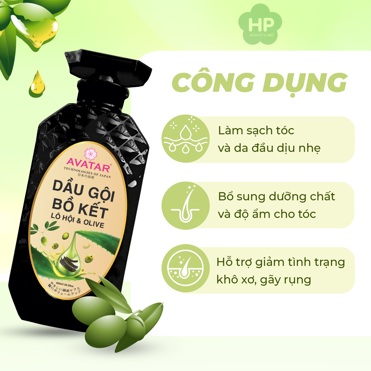 DẦU GỘI PHỤC HỒI TÓC SUÔN MƯỢT AVATAR CHIẾT XUẤT BỒ KẾT LÔ HỘI VÀ OLIVE 600mL Xuất xứ: Việt Nam – Công nghệ Nhật Bản Mã vạch: 8936183971214 CÔNG DỤNG DẦU GỘI ĐẦU BỒ