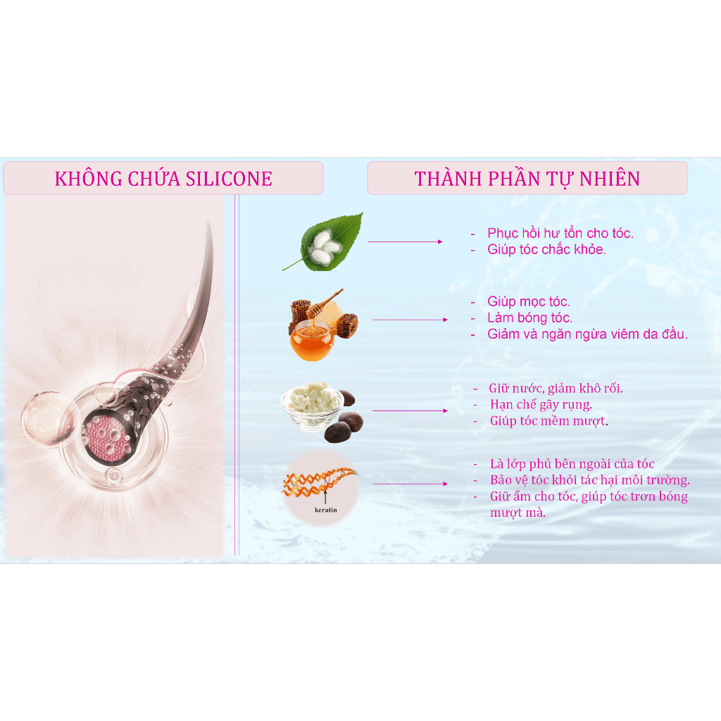 Dầu gội với công thức KHÔNG CHỨA SILICONE, chiết xuất Bơ hạt mỡ, Mật ong, Keratin, Tơ Tằm,..giúp nhẹ nhàng làm sạch bụi bẩn , bã nhờn , đồng thời cấp ẩm sâu để nuôi tóc khỏe mạnh, hạn chế gãy rụng và bóng mượt hơn. Mùi Hương Châu Âu sang trọng