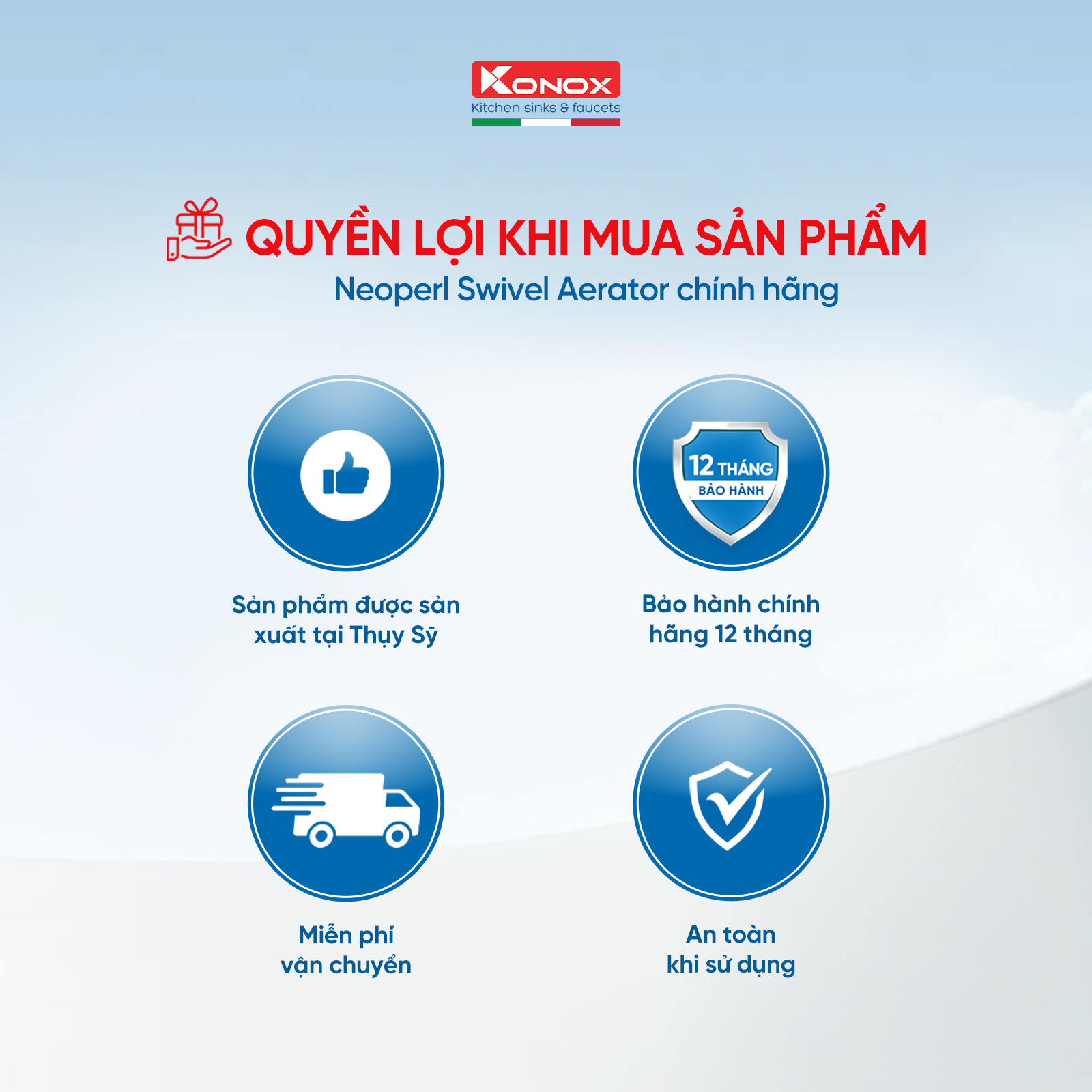 Đầu nối vòi nước thông minh Neoperl Swivel Aerator - SA01 là sản phẩm phụ kiện dành cho vòi rửa bát nóng lạnh thông thường - Sản phẩm có hai ren: Ren trong: 22mm, Ren ngoài: 24mm. SA01 hỗ trợ việc xối rửa hiệu quả hơn bằng cách cho phép xoay 360° tiếp cận mọi góc của bồn rửa.