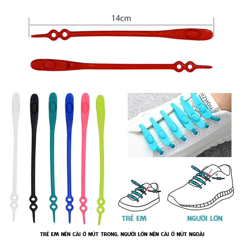 Giới thiệu sản phẩm: Thiết kế thông minh, có 2 nút tăng chỉnh kích thước size tùy ý, phù hợp với cả trẻ em & người lớn (nam lẫn nữ) Đầu dây giày thừa được giấu bên trong khéo léo, không để lộ đầu dây ra ngoài Kích thước mỗi dây dài 14cm, so với phiên bản ngoài thị trường chỉ dài 11.5cm, dễ dàng thao tác, xỏ dây thành các kiểu đan đẹp mắt khác nhau (quý khách có thể tham khảo các cách xỏ khác trên hình ảnh) Chất liệu Silicone đàn hồi, linh hoạt độ vừa, chặt, lỏng. Vẻ ngoài cực thời trang và gọn gàng. Với khả năng ghi nhớ độ co giãn dựa trên kích thước chân của bạn, giúp mang lại cảm giác thoải mái nhất cho đôi chân, phù hợp với tất cả dòng sản phẩm thể thao và thời trang. Bộ sản phẩm bao gồm 14 dây giày với kích thước giống nhau Công dụng sản phẩm: Vượt trội hơn các loại dây giày bằng vải, không thấm nước và dễ lau chùi. Loại đầu neo, dây giày silicone, dễ dàng sử dụng. Tạo cảm giác vừa vặn, không bị đau chân, thoải mái khi đi bộ hoặc chạy thể thao, phù hợp với các hoạt động ngoài trời hay vận động mạnh. Bạn có thể thỏa sức sáng tạo, buộc giày theo các kiểu khác nhau tùy ý. Hạn chế bám bẩn, nhưng nếu bị bám bẩn vẫn dễ dàng lau chùi mà không cần phải tháo dây đem giặt. Tiết kiệm thời gian buộc giày và không bị tuột dây giày như các loại dây truyền thống. Chỉ cần một lần, bạn không cần thắt thêm một lần nào nữa. Hướng dẫn sử dụng: Người lớn nên thắt lỗ phía ngoài, trẻ em nên thắt lỗ phía trong Luôn dây qua lỗ xỏ giày, gài lại nút Tiếp tục tới khi xỏ hết đôi giày, bạn có thể xỏ theo các kiểu giày khác nhau tùy theo ý thích. Lưu ý: Thao tác dùng lực vừa đủ, tránh dùng lực quá mạnh Nếu giày bạn ko phù hợp với cả 2 kích thước lỗ dây, bạn có thể tham khảo thắt dây theo cách khác, ngoài cách thắt truyền thống để phù hợp hơn