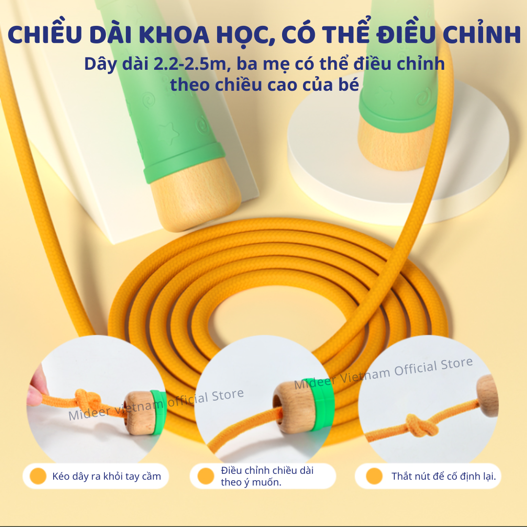 - CHIỀU DÀI KHOA HỌC, CÓ THỂ ĐIỀU CHỈNH Dây dài 2.2-2.5m, nhưng ba mẹ có thể điều chỉnh sao cho phù hợp với chiều cao của con. Ba mẹ chỉ cần làm theo các bước sau: Kéo dây ra khỏi tay cầm. Điều chỉnh chiều dài theo ý muốn. Thắt nút để cố định lại.