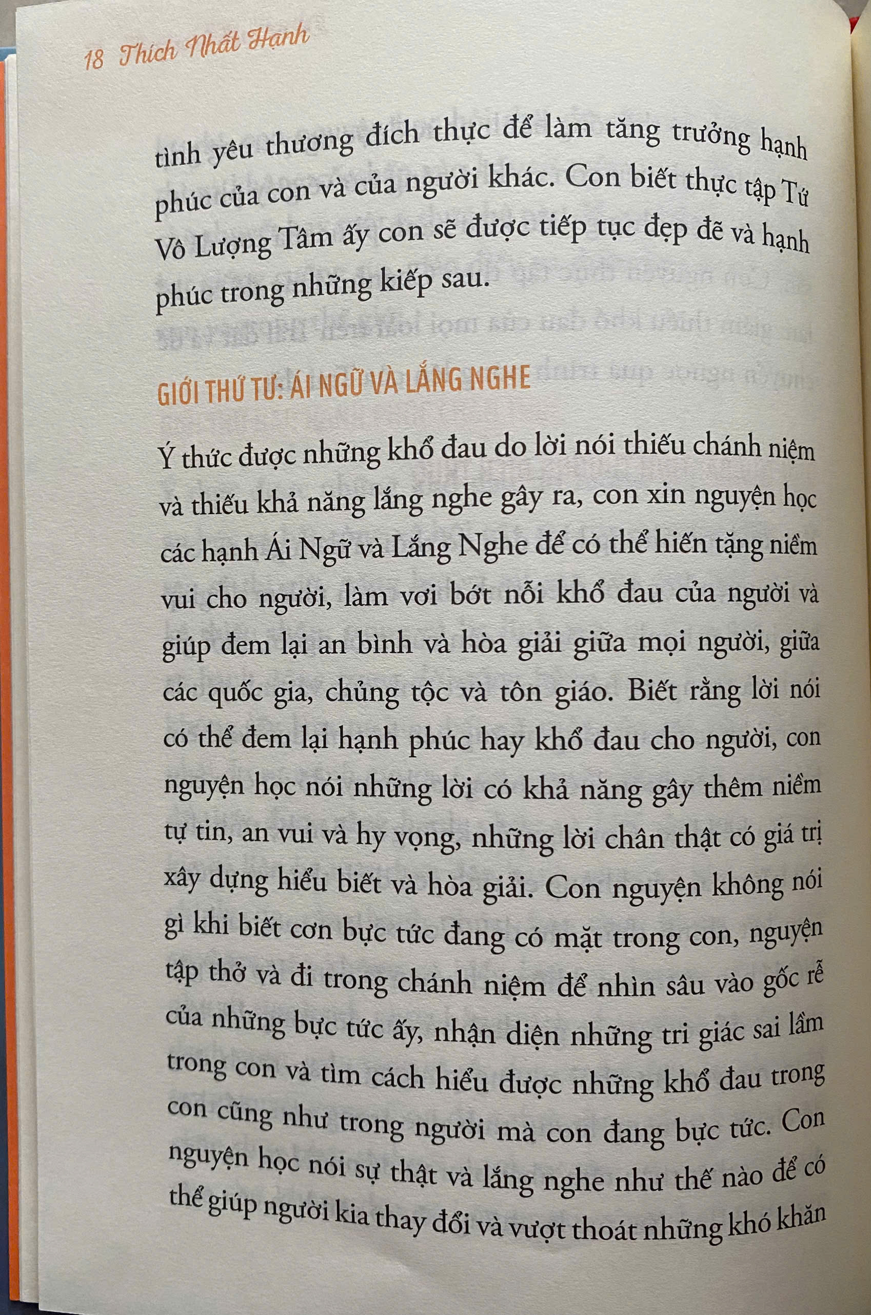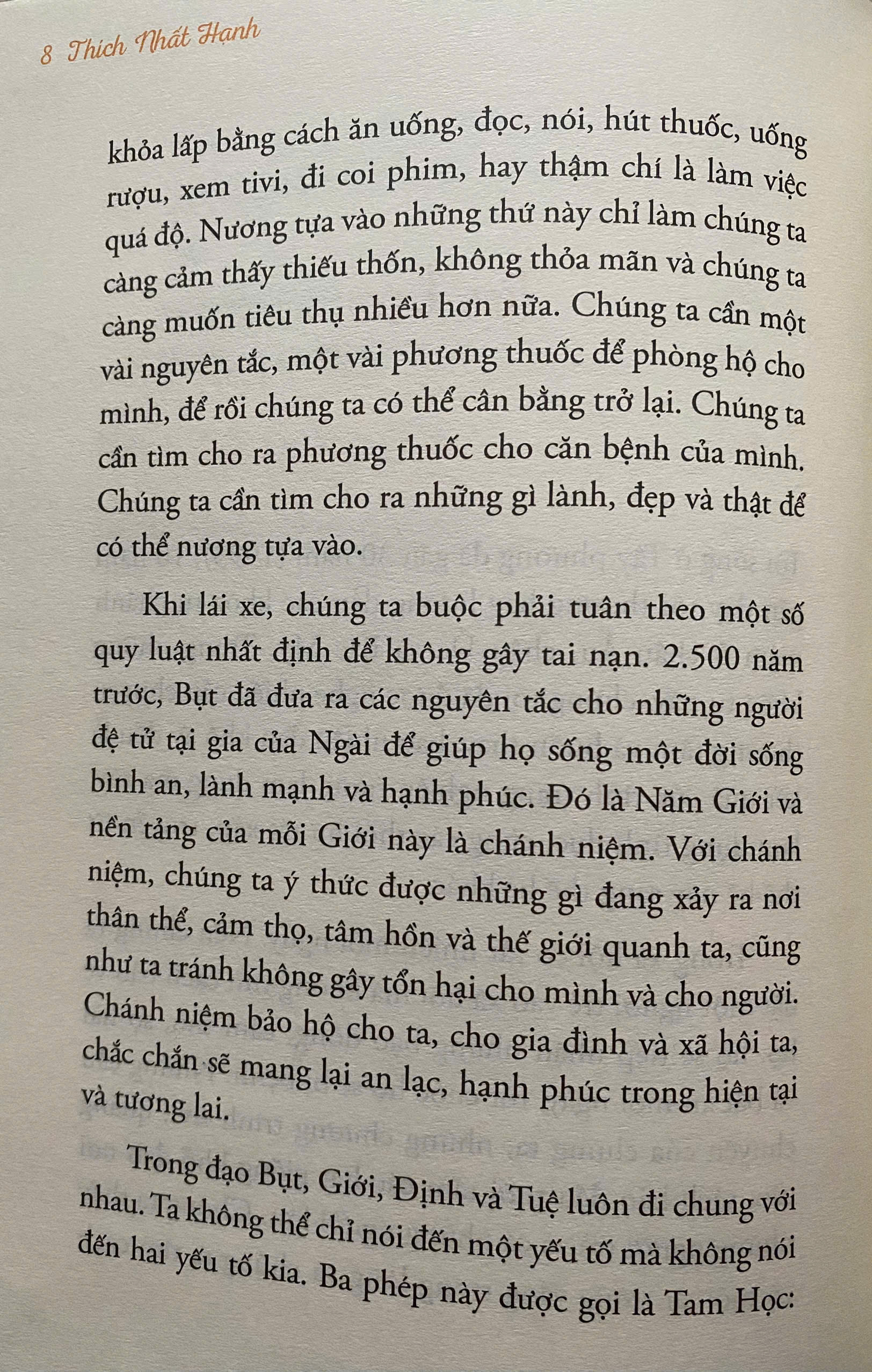 Học hỏi và thực tập theo Năm Giới và nương tựa Tam Bảo chắc chắn sẽ mang lại an lạc cho bản thân, cho cộng đồng và cho xã hội. Là con người, chúng ta cần có một cái gì để tin tưởng, một cái gì lành, đẹp và thật, một cái gì mà ta có thể tiếp xúc. Trong quyển sách này, Năm Giới được diễn bày theo hình thức mới, đó là Bảo vệ sự sống, Hạnh phúc chân thực, Tình thương đích thực, Ái ngữ và Lắng nghe, Nuôi dưỡng và trị liệu.