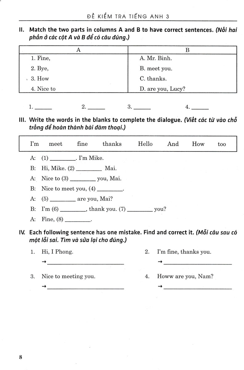 Giới Thiệu sách: Đề Kiểm Tra Tiếng Anh 3 (Theo Chương Trình SGK Mới) Nội dung cuốn sách gồm các đề kiểm tra đa dạng và phong phú bám sát từ vựng, ngữ pháp trong