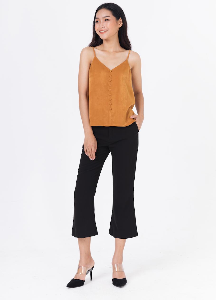 Áo 2 Dây với hàng cúc bọc tạo điểm nhấn trẻ trung, nữ tính. Áo có thể phối theo nhiều phong cách, với quần sóc hay quần tây cá tính, hoặc với chân váy xoè điệu đà. Áo có 4 mầu: vàng đất, hồng đỗ, đen và xanh than