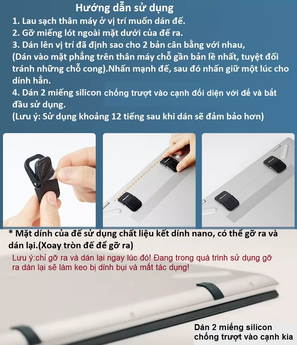 - Chất liệu hợp kim nhôm không gỉ, siêu vững, không gây kích ứng da - Thiết kế siêu mỏng, gọn, nhẹ, dán luôn ở mặt đáy của laptop, khi sử dụng chỉ cần gạt