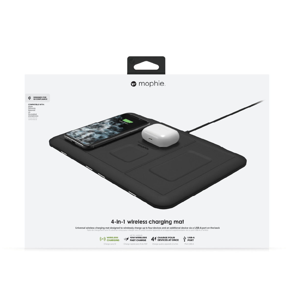 ĐẾ SẠC MOPHIE 4 IN 1 SẠC ĐA THIẾT BỊ - TRỌN TIỆN ÍCH Đế sạc Mophie 4 in 1   Mophie là một trong những thương hiệu phụ kiện chất lượng hàng đầu thế giới đến từ Mỹ, được tin dùng và bán rộng rãi tại các chuỗi cửa hàng Apple trên toàn cầu. Mophie mang đến những trải nghiệm cao cấp dành riêng cho tín đồ nhà Táo thông qua các sản phẩm pin dự phòng, cáp sạc của hãng. ĐẾ SẠC MOPHIE 4IN1 với thiết kế sang trọng, cao cấp, hỗ trợ sạc không dây chuẩn Qi cho công suất lên tới 10W, cho phép sạc không dây tối đa lên tới 4 thiết bị cùng một lúc, trang bị thêm cổng sạc Type A 5W, giá đứng cho Apple Watch. Sản phẩm là sự lựa chọn đầy tiện ích đặc biệt dành cho những ai đang tìm kiếm một phụ kiện chất lượng nạp nhanh năng lượng đồng thời cho nhiều thiết bị. Cùng tìm hiểu chi tiết hơn về sản phẩm này.   THIẾT KẾ MỎNG NHẸ, SANG TRỌNG, DỄ DÀNG CĂN CHỈNH ĐẾ SẠC MOPHIE 4IN1 được thiết kế hình chữ nhật với kích thước chính xác là  28.2 cm x 19.2 cm x 1.6 cm, trọng lượng 606 gam. Bề mặt của đế sạc được bao phủ bằng chất liệu Fabric cao cấp tạo sự sang trọng, hợp thời trang, đây chính là thiết kế đặc trưng làm nên thương hiệu Mophie giúp chống dấu vân tay, chống trầy xước hiệu quả, dễ dàng vệ sinh. Bề mặt đế sạc được chia ra thành từng phần rõ ràng giúp bạn căn chỉnh thiết bị khi sạc một cách dễ dàng hơn. Thiết kế thời trang, sang trọng, bề mặt vải Fabric cao cấp, chống dấu vân tay, dễ dàng căn chỉnh   HỖ TRỢ SẠC KHÔNG DÂY CHUẨN Qi TỐI ĐA 4 THIẾT BỊ, CÔNG SUẤT LÊN TỚI 10W ĐẾ SẠC MOPHIE 4IN1 tích hợp công nghệ sạc không dây chuẩn Qi sạc an toàn và hiệu quả cho hầu hết các thiết bị: Apple, Samsung, Motorola, LG, các thiết bị hỗ trợ sạc Qi,...cho công suất lên tới 10W, cho phép sạc không dây tối đa lên tới 4 thiết bị cùng 1 lúc. Đế sạc được trang bị thêm một cổng sạc output USB-A công suất 5W giúp bạn có thể sạc thêm cho một thiết bị khác khi cần. Cho phép sạc không dây tối đa lên tới 4 thiết bị cùng 1 lúc, trang bị thêm một cổng sạc output USB-A 5W   TÍCH HỢP GIÁ ĐỠ TIỆN DỤNG CHO APPLE WATCH ĐẾ SẠC MOPHIE 4IN1 gia tăng sự tiện ích bằng việc tích hợp thêm giá đỡ dành cho Apple Watch, bạn hoàn toàn có thể đặt Apple Watch lên giá đỡ, sử dụng cổng sạc type A 5W trên thân đế sạc để nạp năng lượng cho thiết bị vô cùng tiện dụng, hữu ích. Tích hợp giá đỡ tiện dụng cho Apple Watch   MẠCH CẢM BIẾN BẢO VỆ AN TOÀN CHO BẠN VÀ THIẾT BỊ ĐẾ SẠC MOPHIE 4IN1 được trang bị thêm mạch cảm biến giúp phát hiện và loại trừ các đường truyền bất ổn, đảm bảo thiết bị sạc ổn định và được sử dụng an toàn. Đèn LED thông báo sẽ bật lên khi thiết bị được nhận sạc. Mạch cảm biến được bảo vệ, phát hiện và loại trừ các đường truyền bất ổn, đảm bảo thiết bị sạc ổn định và được sử dụng an toàn SẠC KHÔNG DÂY KHÔNG CẦN THÁO ỐP ĐẾ SẠC MOPHIE 4IN1 cho khả năng sạc được cho các thiết bị trong khoảng cách lên đến 3mm cùng công suất sạc lên tới 10W, nhờ đó, bạn có thể nạp nhanh năng lượng cho điện thoại một cách dễ dàng, nhanh chóng mà không cần tháo vỏ ốp. Khả năng sạc được cho điện thoại trong khoảng cách lên đến 3mm mà không cần tháo vỏ ốp   BẢO HÀNH ĐIỆN TỬ, 2 NĂM 1 ĐỔI 1 Tất cả các sản phẩm Mophie, bạn hoàn toàn có thể chủ động tra cứu thông tin sản phẩm. Với chính sách bảo hành tối ưu lên tới 2 năm 1 đổi 1 giúp bạn hoàn toàn tin tưởng, an tâm trong quá trình sử dụng. Tối giản phong cách sạc chính là điều mà chúng ta đang hướng tới. Bỏ qua mọi công đoạn tìm dây sạc, cắm sạc, với ĐẾ SẠC MOPHIE 4IN1, chỉ cần một tháo tác đơn giản: đặt thiết bị lên, bạn đã có thể sạc pin cho tất cả các thiết bị của bạn, một sự thay đổi nhỏ nhưng mang đến cho bạn những tiện ích thú vị, hiện đại hơn. Sản phẩm phù hợp dành cho những ai đang sử dụng nhiều thiết bị di động.