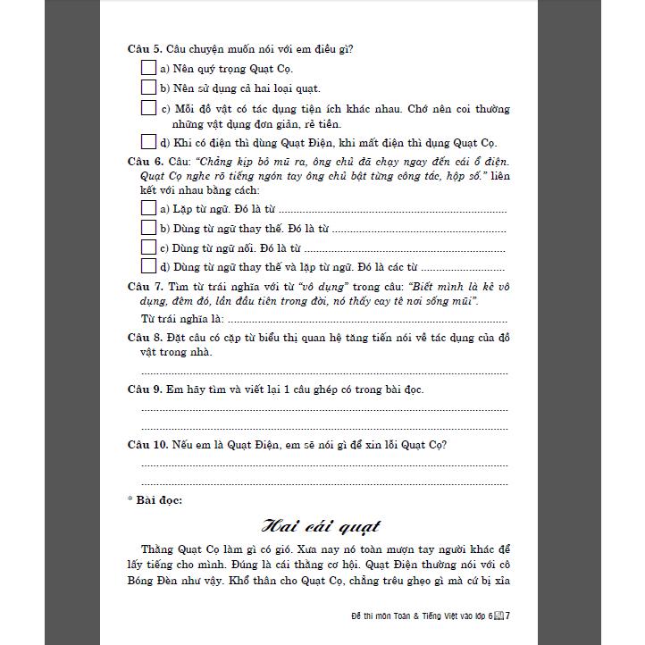 Với quyển "Đề thi môn Toán và Tiếng Việt vào lớp 6", hi vọng các em sẽ thuận tiện hơn cho việc ôn tập và rèn luyện; phát huy được những ưu điểm trong quá trình kiểm tra.