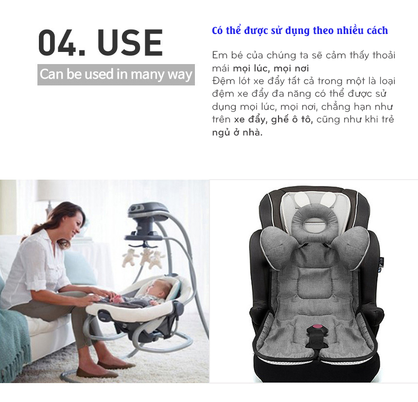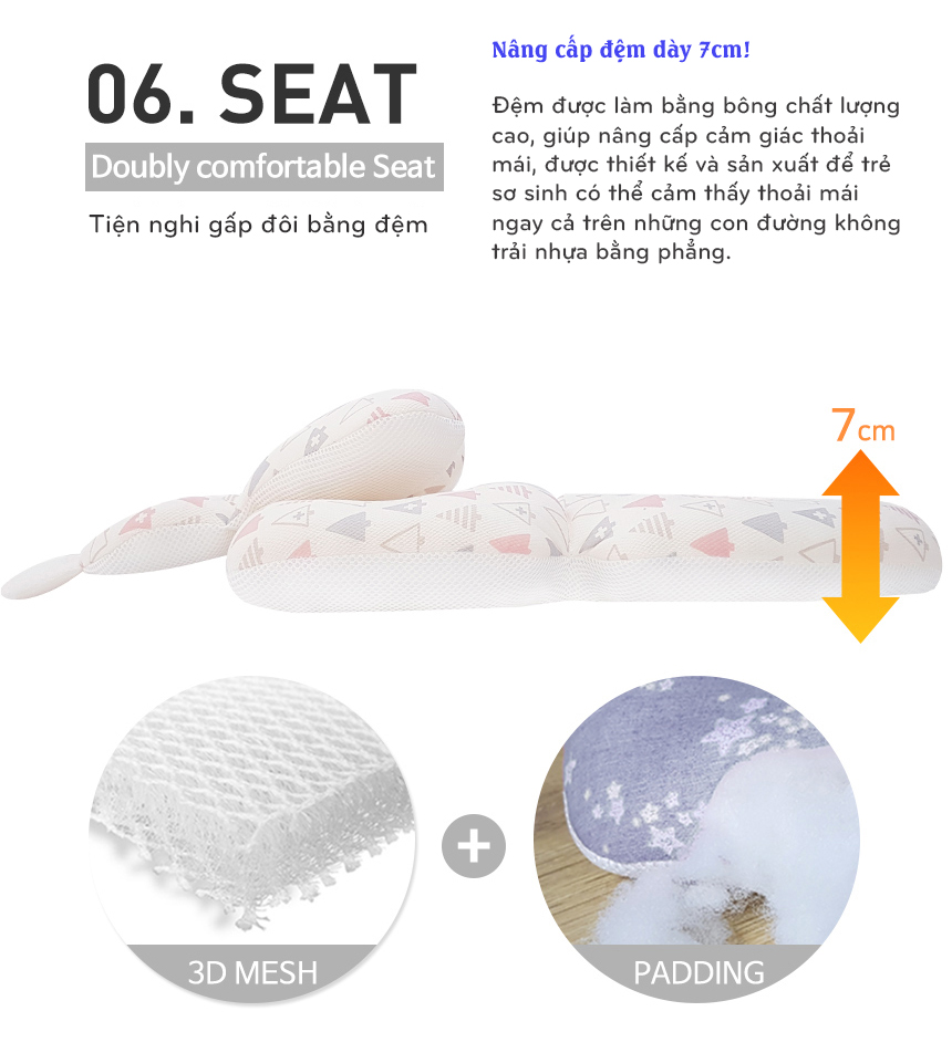 - Đệm được làm bằng bông chất lượng cao, giúp nâng cấp cảm giác đệm và được thiết kế và sản xuất để trẻ sơ sinh có thể cảm thấy thoải mái ngay cả trên những con đường không trải nhựa bằng phẳng. Chi tiết sản phẩm: