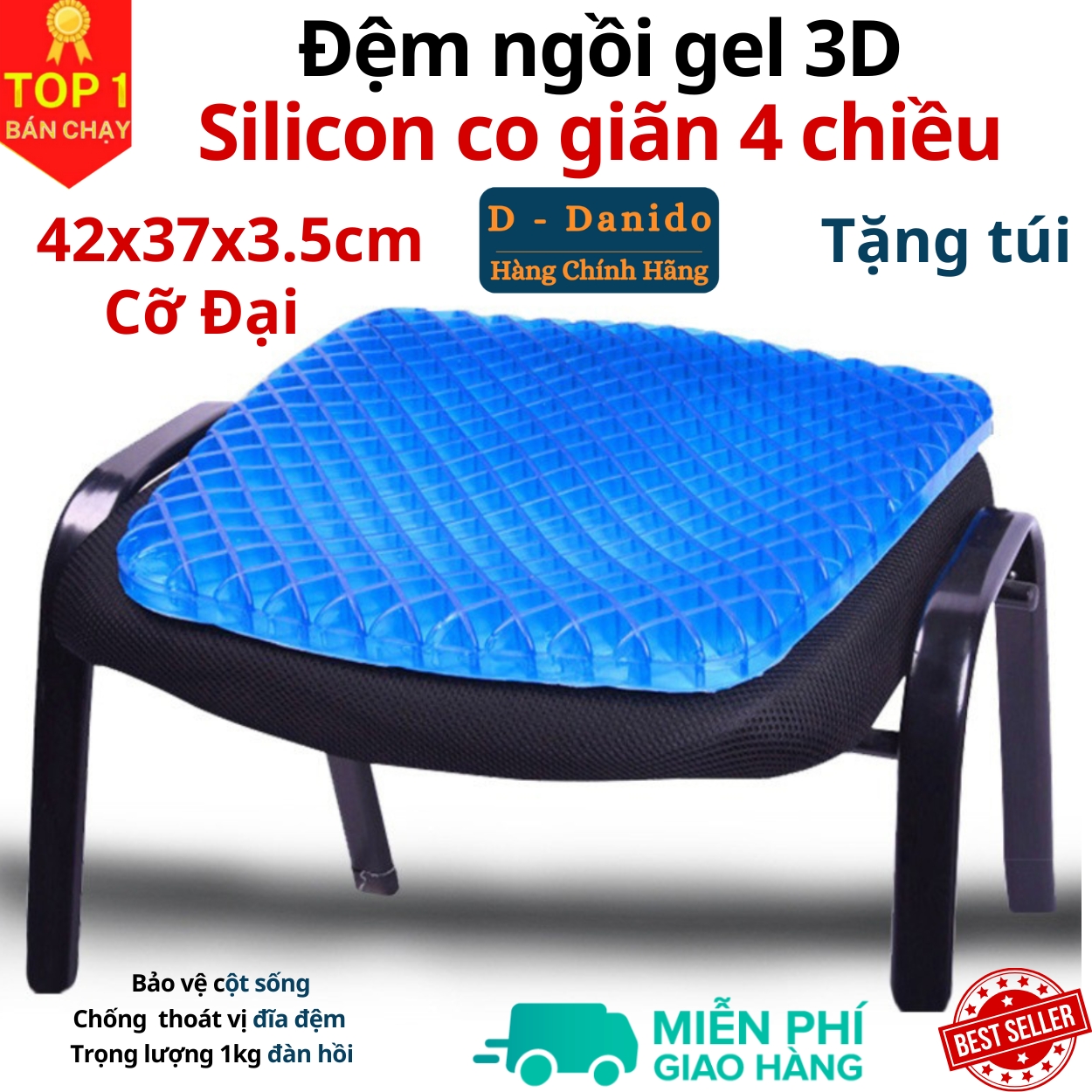 - Mặt dưới của đệm được thiết kế thông minh với chất liệu đặc biệt có khả năng bám dính cao tránh trơn trượt, dùng được cho mọi chất liệu ghế. - Đệm (nệm) ngồi thông minh 3D thoáng khí với công dụng đa năng cho mọi lứa tuổi sử dụng: người bị bệnh trĩ, đau cột sống, thoát vị đĩa đệm, đau thần kinh tọa, giãn tỉnh mạch; người thường xuyên ngồi nhiều như dân văn phòng, các bác tài, người cao tuổi Chất liệu Silicon mềm mại, êm ái với khả nằng đàn hồi siêu đỉnh đem lại độ bền cao cho sản phẩm ! Thiết kế tổ ong thoáng khí đem lại cảm giác ngồi cực kỳ thoải mái, dễ chịu hạn chế lực tác động lên mông gây khó chịu khi phải ngồi trong thời gian dài Tặng kèm vỏ gối tiện lợi Sản phẩm dễ dàng làm sạch chỉ cần rửa qua với nước Thiết kế thông minh đem lại tác dụng tuyệt vời Công dụng đa năng phù hợp với mọi lứa tuổi ! D Danido xin chân thành cảm ơn Quý khách đã tin tưởng và sử dụng sản phẩm của shop Kính chúc Quý khách có những trải nghiệm tuyệt vời cùng sản phẩm ! Lựa chọn hàng chính hãng để được đảm bảo sản phẩm đạt chất lượng bởi Tiki !