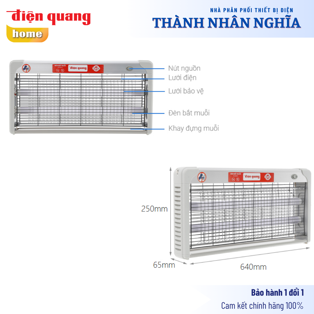 - Đèn Bắt Muỗi Điện Quang ĐQ EML06L (247 x 65 x 131 mm) được lồng ghép chất liệu nhôm và nhựa có độ bền cao, an toàn cho người sử dụng. - Lưới điện