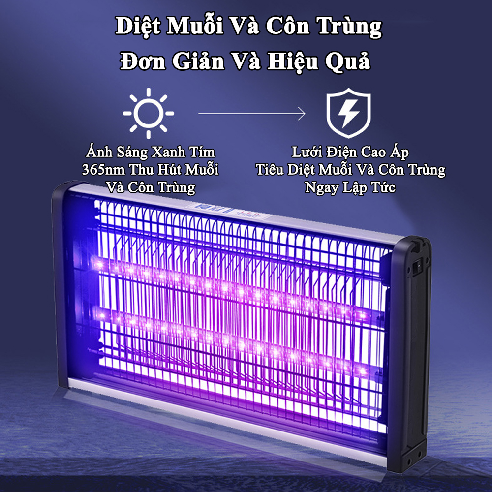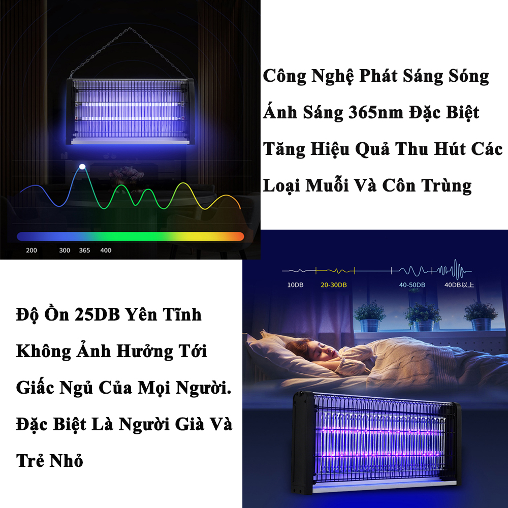 - Đèn bắt muỗi côn trùng bằng cách sử dụng đèn LED phát ra ánh sáng xanh tím UVA có bước sóng 365nm đặc biệt thu hút đến 30 loại côn trùng như ruồi, muỗi, kiến ba khoang và các loại côn trùng bay khác và tiêu diệt chúng ngay khi bị chạm vào.
