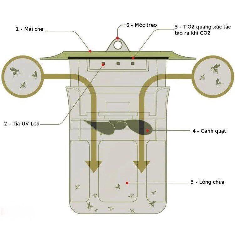 - Sau khi bị thu hút muỗi sẽ bị chiếc quạt gió được thiết kế theo vòng xoáy khiến côn trùng khó lòng thoát ra ngoài.