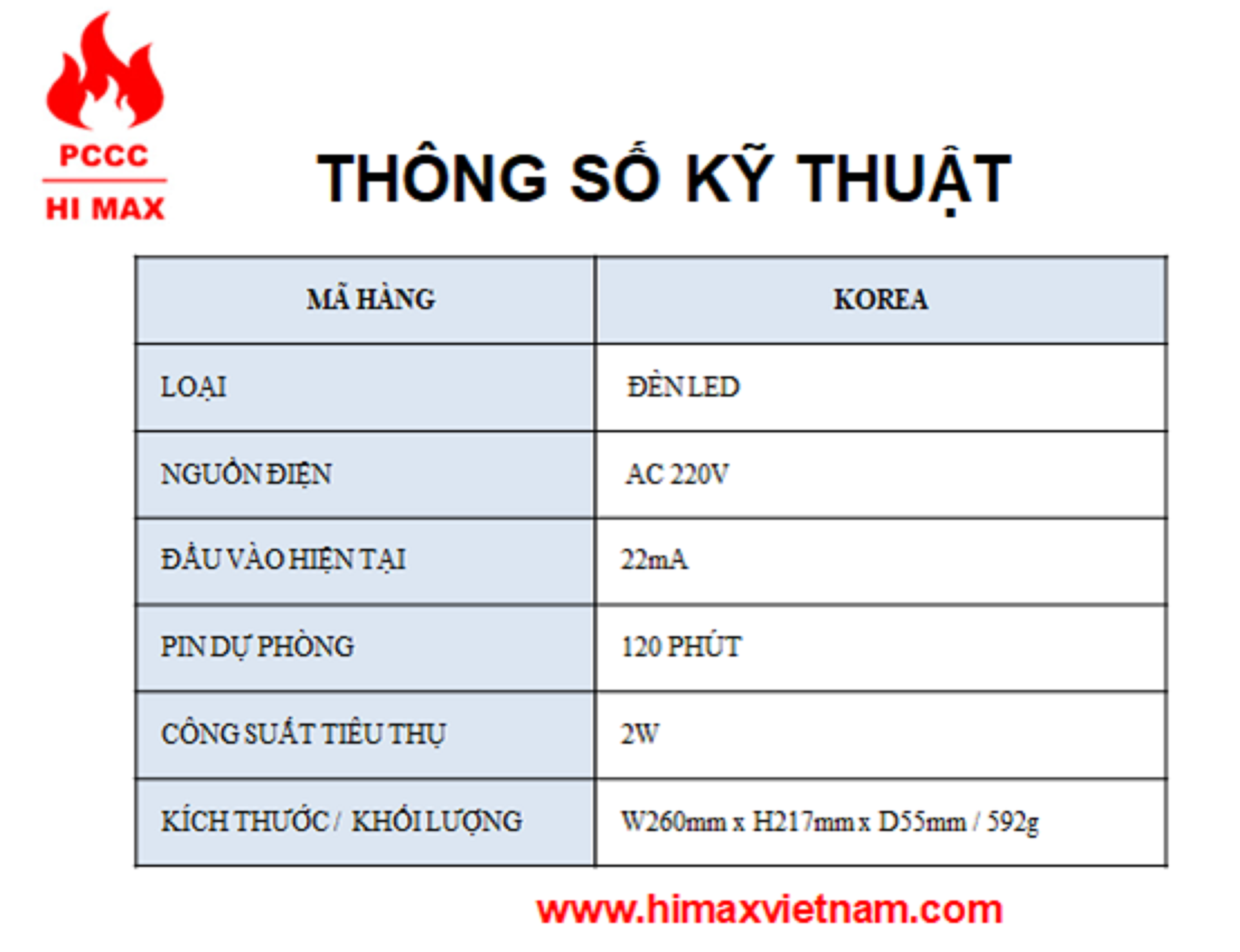 MÃ HÀNG: KOREA LOẠI: ĐÈN LED NGUỒN ĐIỆN: AC 220V, 50/60Hz PIN DỰ PHÒNG: 400 mAh x 3.6V (Ni-Cd) KÍCH THƯỚC/KHỐI LƯỢNG: W260mm x H217mm x D55mm / 592g ĐẦU VÀO HIỆN TẠI: 22mA THỜI GIAN CHIẾU SÁNG KHI MẤT ĐIỆN: 120 PHÚT CÔNG SUẤT TIÊU THỤ: 2W #himax #pccc #baochay #hanquoc #vietnam #kiemdinh #hethongpccc #himaxvietnam #hethongbaochay #antoanchongno #baochayhimax #korea #thietbibaochay #baochaytudong #antoanchayno #KOREA #chieusangkhancap #denchieusangkhancap #denthoathiem #denmatech #denkhancap #denpin #PCCC #antoanchayno #himax