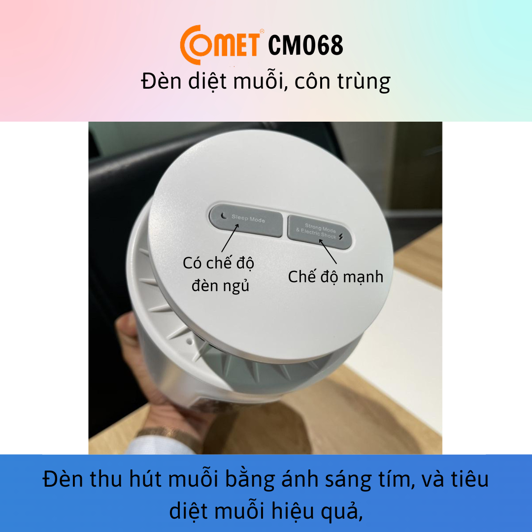 Đèn diệt muỗi đa năng 3 trong 1 Quạt-Lưới điện-Tia cực tím Comet CM068 – Hàng chính hãng, diệt muỗi, côn trùng bằng cơ chế thụ động và chủ động. Đèn tím phát ra tia UV thu hút muỗi. Khi muỗi bay đến gần đèn sẽ bị quạt điện hút muỗi vào trong thân đèn. Thân đèn có lưới điện áp cao, giúp việc diệt muỗi hiệu quả tức thời.